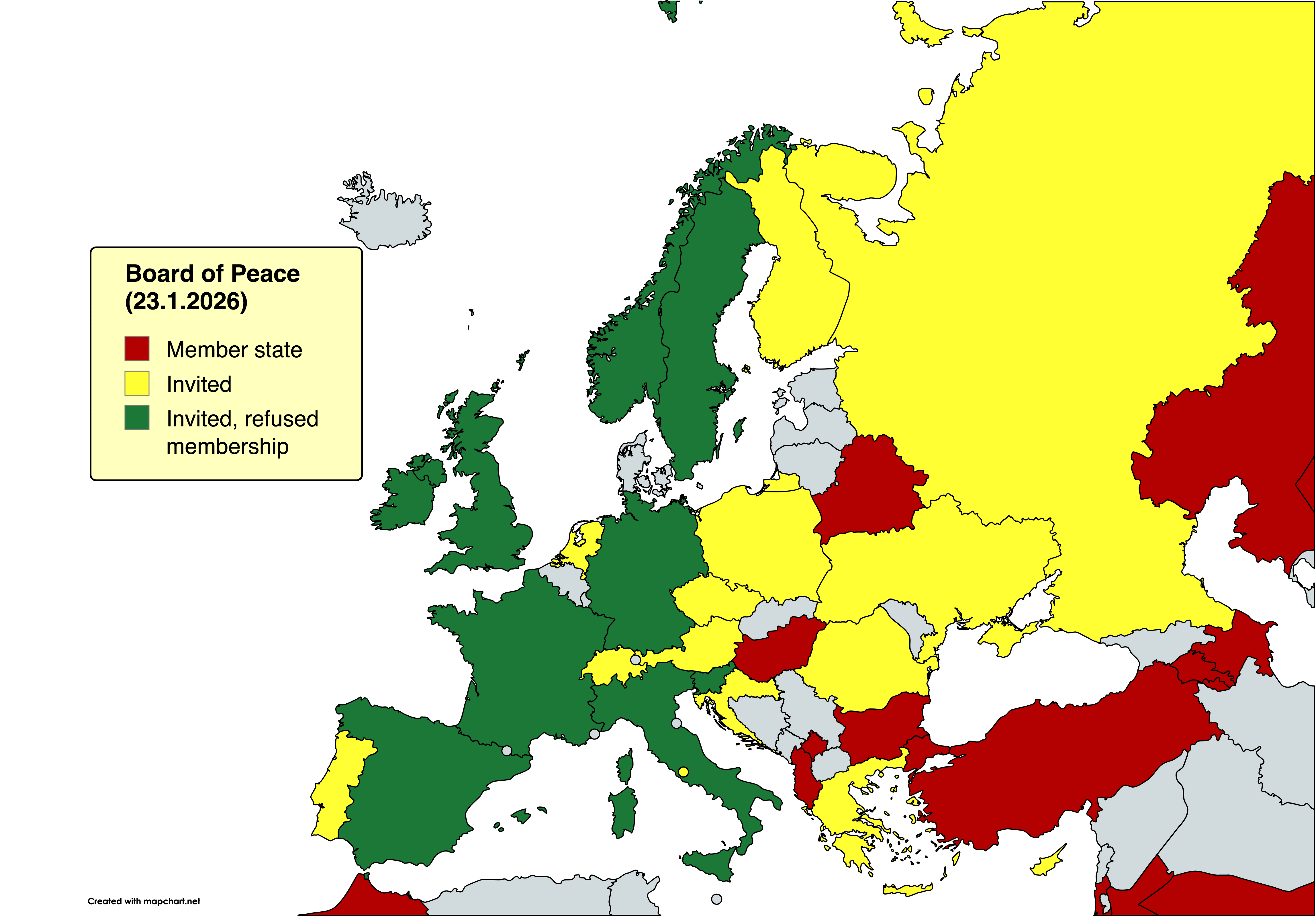 BoP was announced 29.9.2025 and was established yesterday, 22.1.2026. It has 26 member states. A state can obtain a permanent seat by paying 1 billion (10^(9)) US dollar fee into fund controlled by Donald Trump. Notably Denmark has not received an invitation and Canada was originally invited but the invitation was later withdrawn.