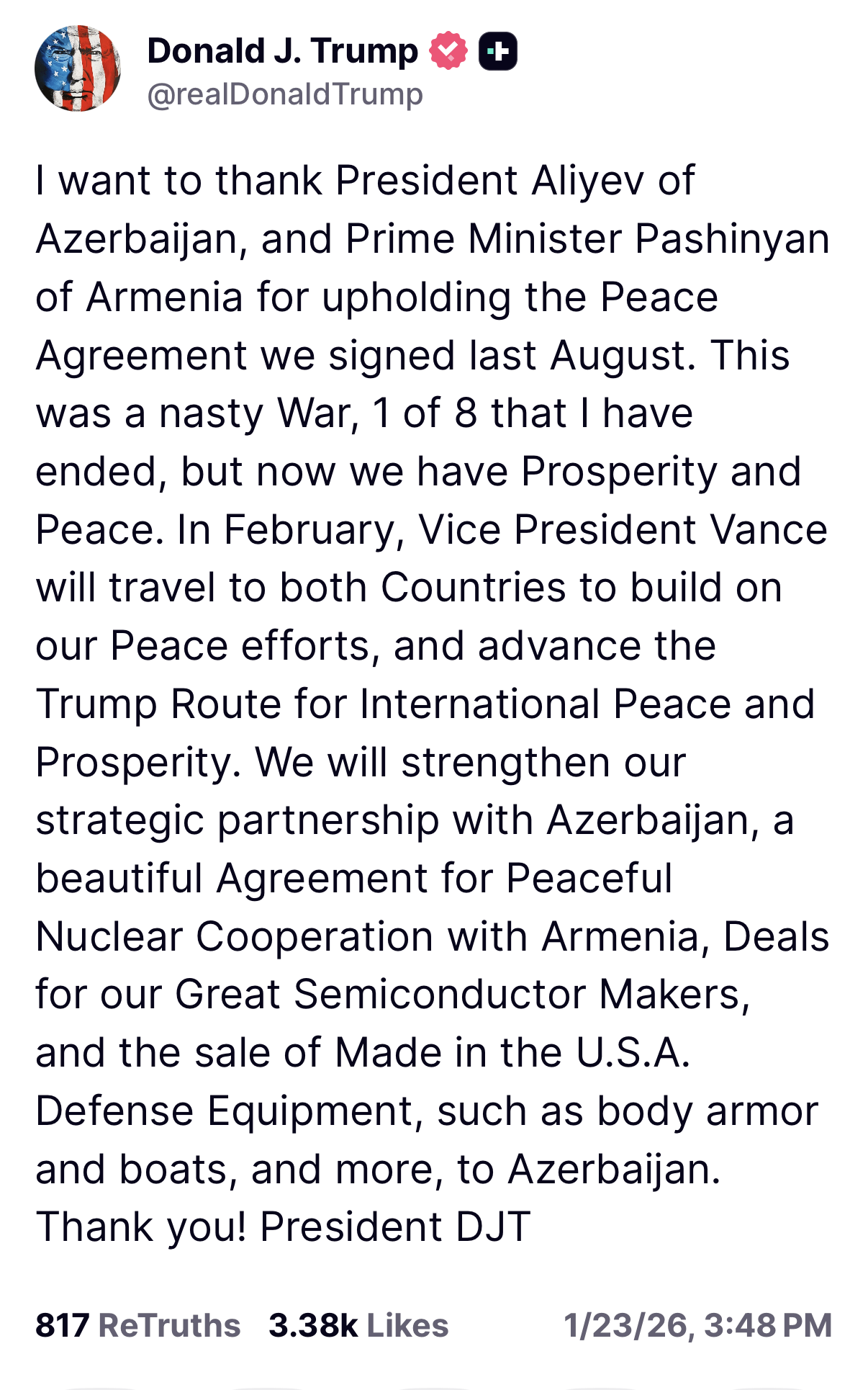 Datark123 on 24/01/2026 00:42 So the rumors about a potential Vance visit in February turns out to be true. Also, did Trump just reveal that Armenia will be choosing an American reactor for the nuclear power plant?
