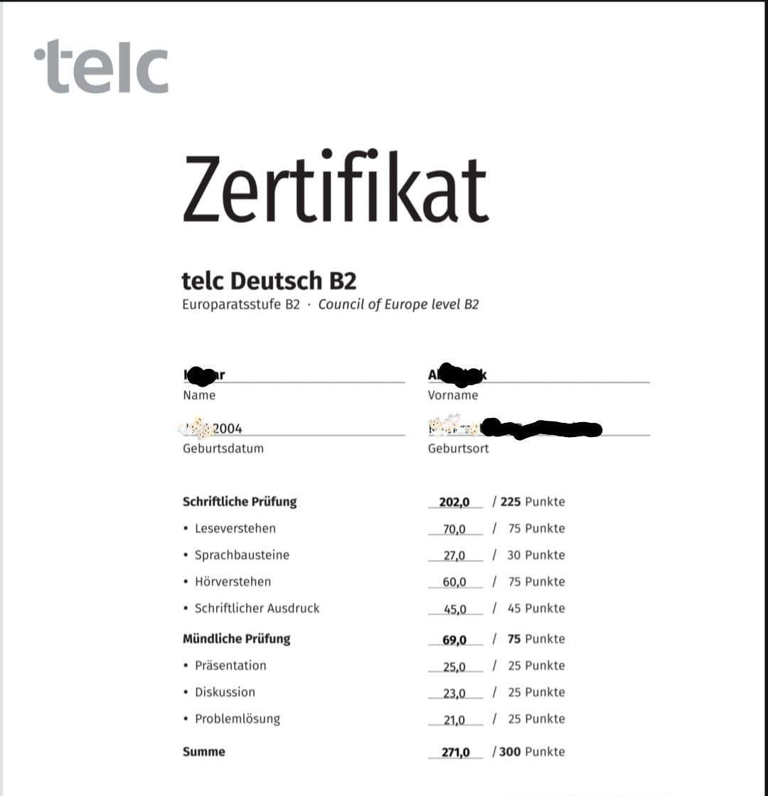 Non riesco ancora a credere ai miei occhi. Sembra tutto un sogno.. 2 mesi fa ho sostenuto l’esame Goethe b1 e sono stato bocciato sia nel modulo hören che nel modulo sprechen per pochi punti. Dopodiché ho preso un tutor personale solo per Sprechen e ho fatto più di 20 modelltest, ho anche esercitato quotidianamente esercizi di grammatica che in precedenza era il mio punto debole. Prima balbettavo molto durante la presentazione, ma ho preso il massimo dei voti, come frrr. Se avete domande o suggerimenti per qualsiasi modulo o semplicemente in generale, non esitate a chiedere..😌