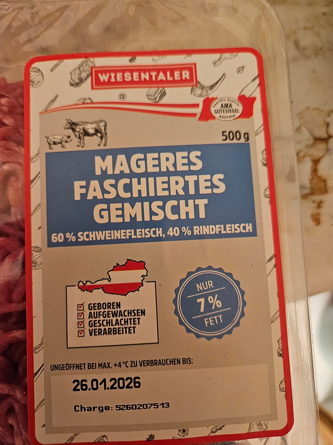 das problem beim abgepackten faschierten is eh das wasser und nicht obs jetzt 50:50 oder 60:40 is. da wird zum faschieren mehr oder weniger eis beigemischt. in erster linie damits nicht zu warm wird, aber halt auch weil man mit 10-20% beigemischtem wasser „500g“ verkaufen kann wovon 100g halt nur wasser sind.