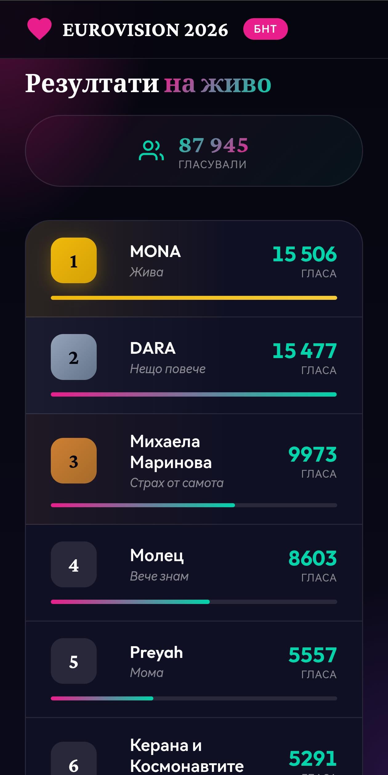IndustrialDisciple on 24/01/2026 23:25 На мен като че ли Прея най ми хареса. Innerglow също. Ще ми се да кажа и Керана и Космонавните, но песента според мен не е на ниво Евровизия. Малко ми е криво от изпълнението на Диа. От много време искам да я видя на Евровизия и накрая като ѝ се даде шанс, излезе с посредствена песен.