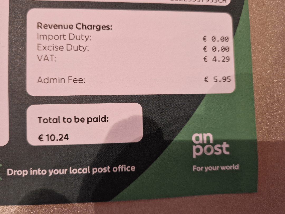 It’s annoying and I’ve had instances where an admin fee was charged to me but no admin was actually done (they charged me import VAT on textbooks which should be VAT exempt), but overall I think €4.95 for a few minutes of a worker’s time is fair enough.