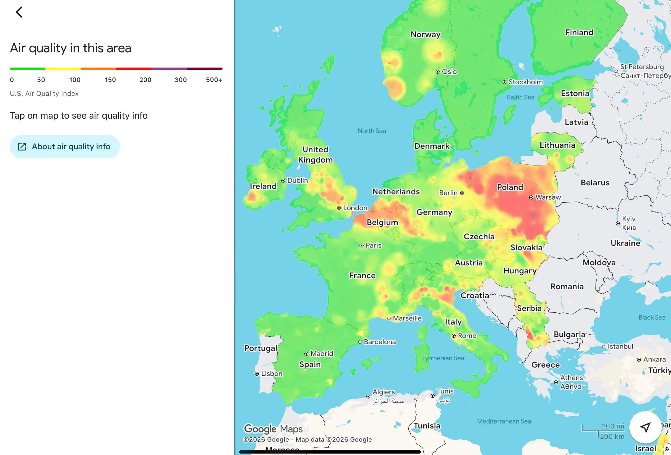 Stavo guardando la mappa di Google e sono rimasto sorpreso nel vedere quanto sia pessima la qualità dell’aria in Belgio… qualcuno può spiegarmi cosa lo causa? C’è un incendio boschivo??? D’inverno è sempre così brutto??