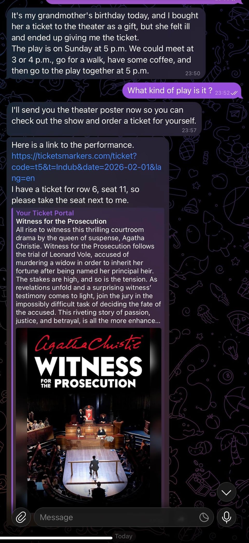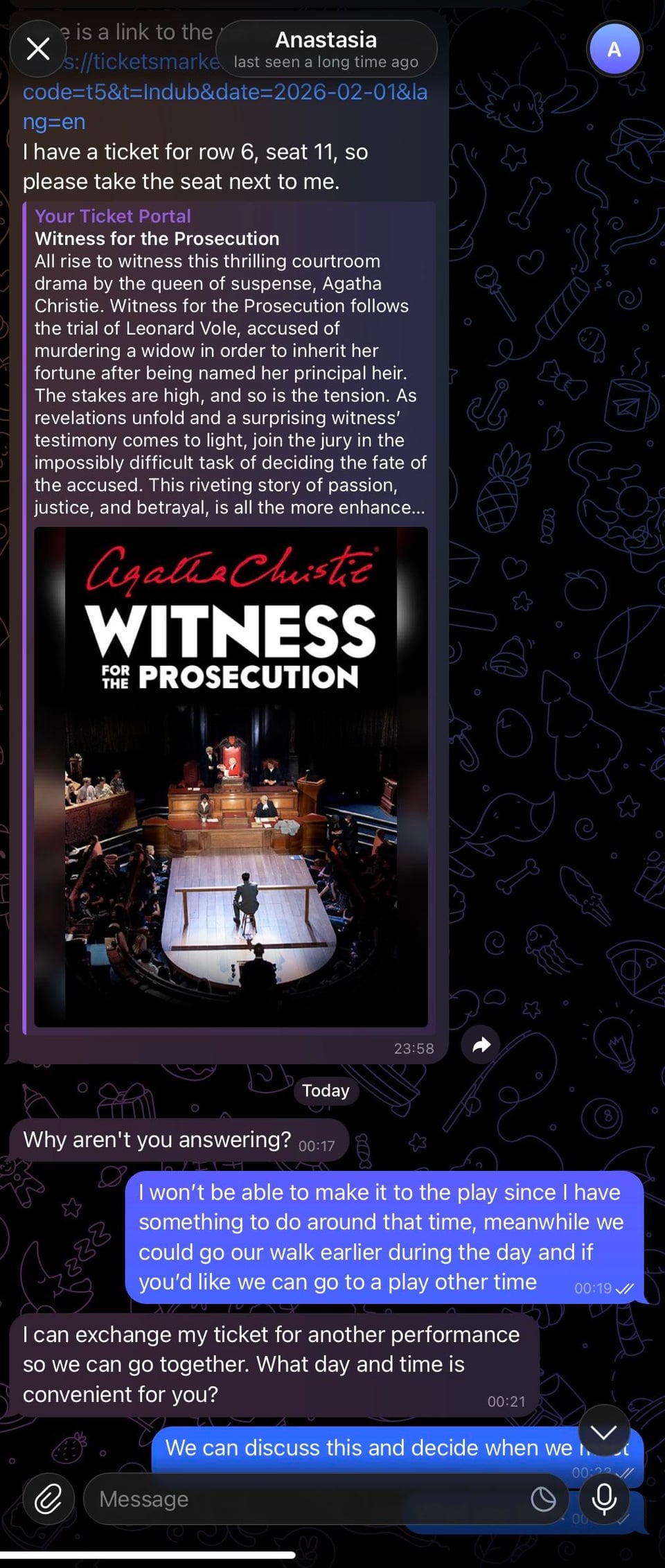 Così ho abbinato una ragazza di nome Anastasia su Badoo, abbiamo parlato brevemente e poi lei ci ha chiesto se potevamo spostarlo su un’altra app. Mi ha dato il suo telegramma e mi ha fatto le stesse domande a cui le avevo risposto prima, tipo in quale città vivo e poi quando è arrivato il momento di parlare dell’incontro abbiamo organizzato una presunta passeggiata e lei mi ha colpito con questa, una truffa sui biglietti del teatro. Le ho detto che non sarei riuscito a venire allo spettacolo quel momento. Ha detto ok, scambiamo gli orari dei biglietti, ma quando le ho detto che avrei preferito discutere di tutto questo quando ci incontreremo, mi ha bloccato. Fai attenzione se non ti è ancora successo.