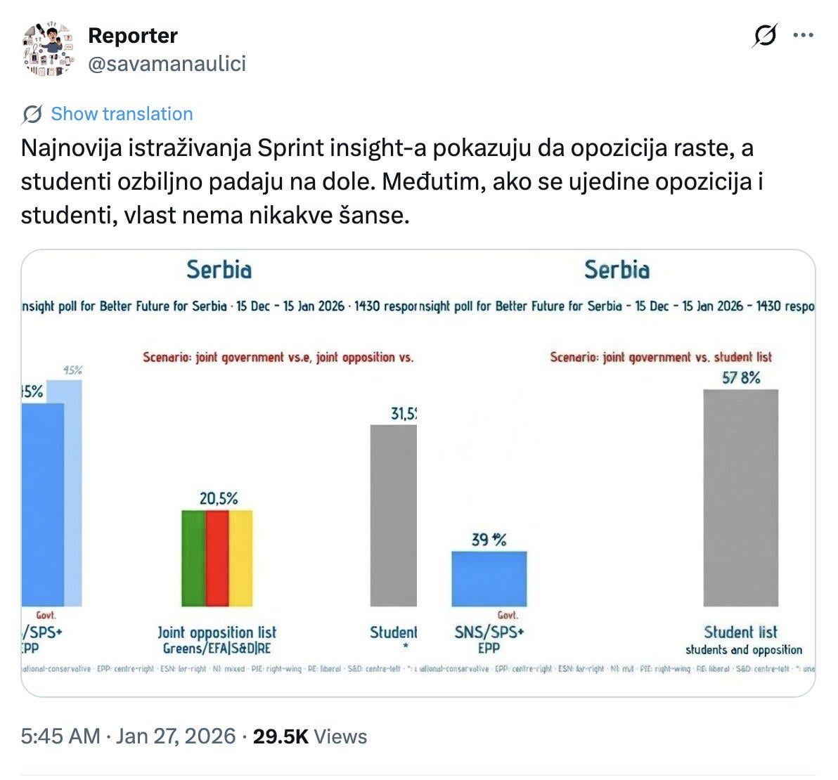 "Per quanto riguarda le informazioni false e inventate che circolano sui social media e vengono presentate come ricerche sull’opinione pubblica, Sprint Insight dichiara che non abbiamo condotto alcuna ricerca sull’opinione pubblica di alcun tipo nella Repubblica di Serbia tra il 15 dicembre e il 15 gennaio.