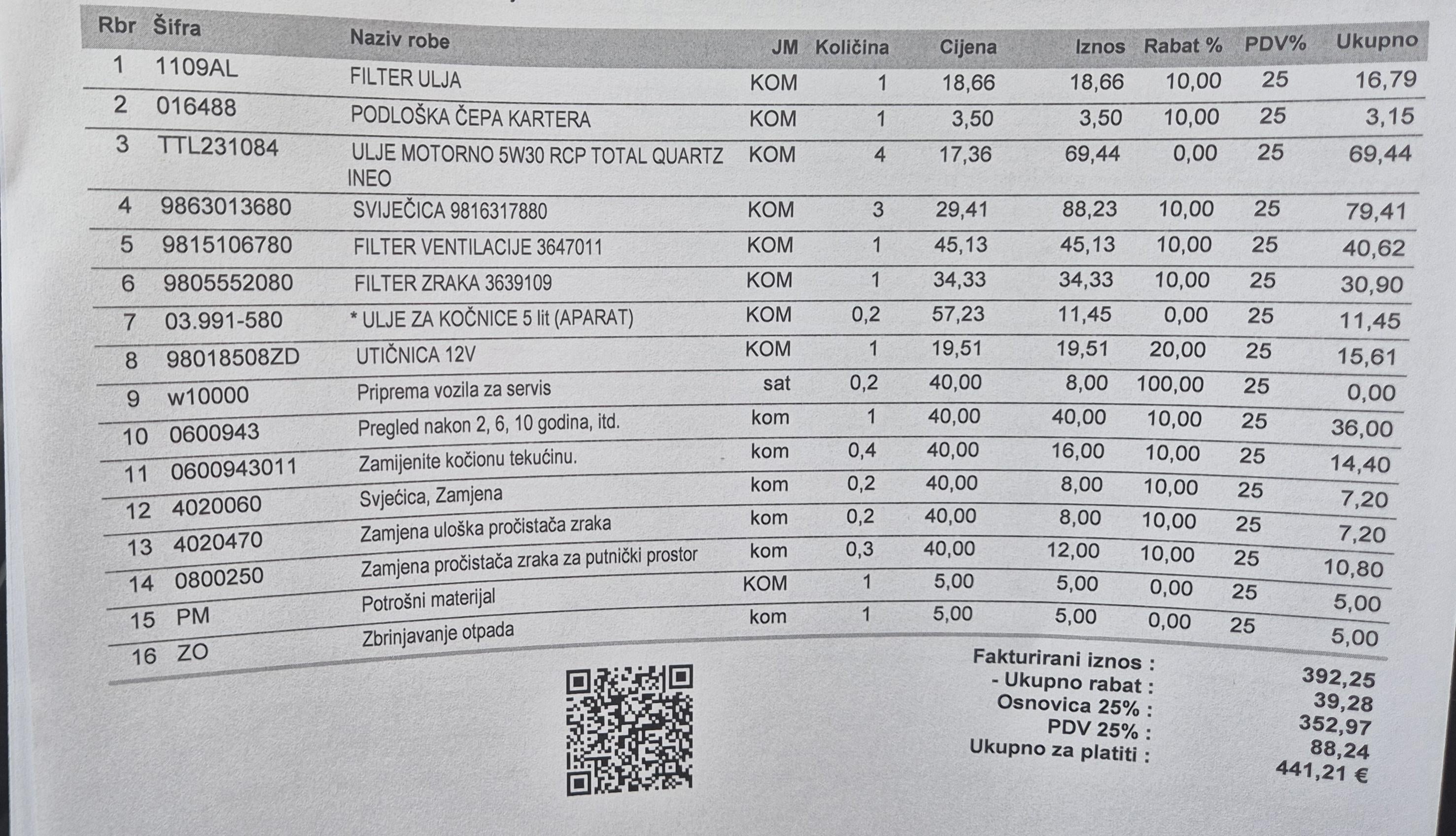 Fiuman_1987 on 28/01/2026 14:11 Jesu, ali sam si išao u ovlašteni servis. Ako je auto pod garancijom, ok. Ali ako nije,lud si. * 30 eura po svijećici, neznam koje su ali NGK Iridum 4xkomada sam platio 44€ 30 eura filter zraka 3 eura za podlošku čepa kartera, koju nije ni promijenio vjv
