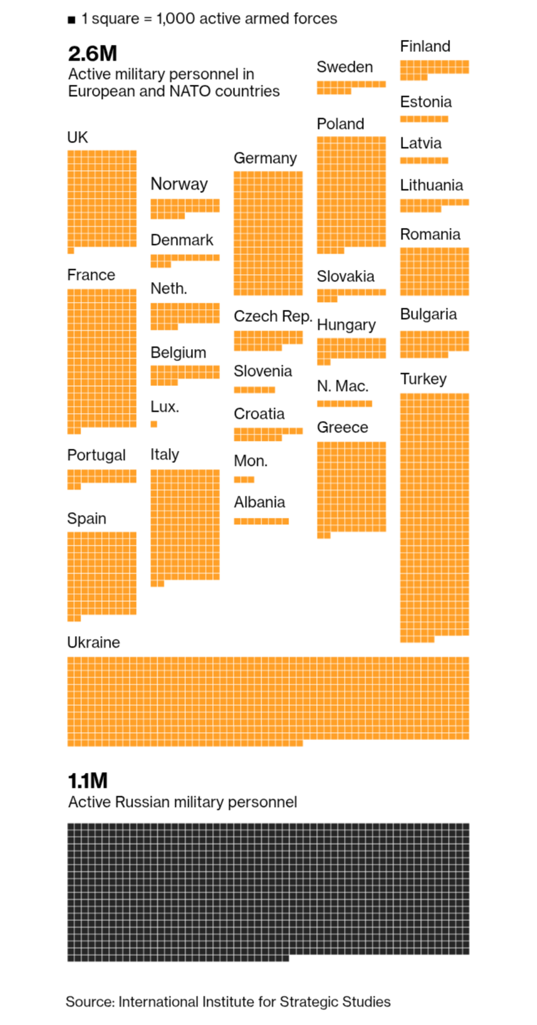 The soldiers from Ukraine and around Europe who have been deployed are so battle hardened and experienced that their soldiers would create synergy, greater than the sum of its part. If used correctly with other European units, the multiplier of Europe’s number of soldiers would be x1.7