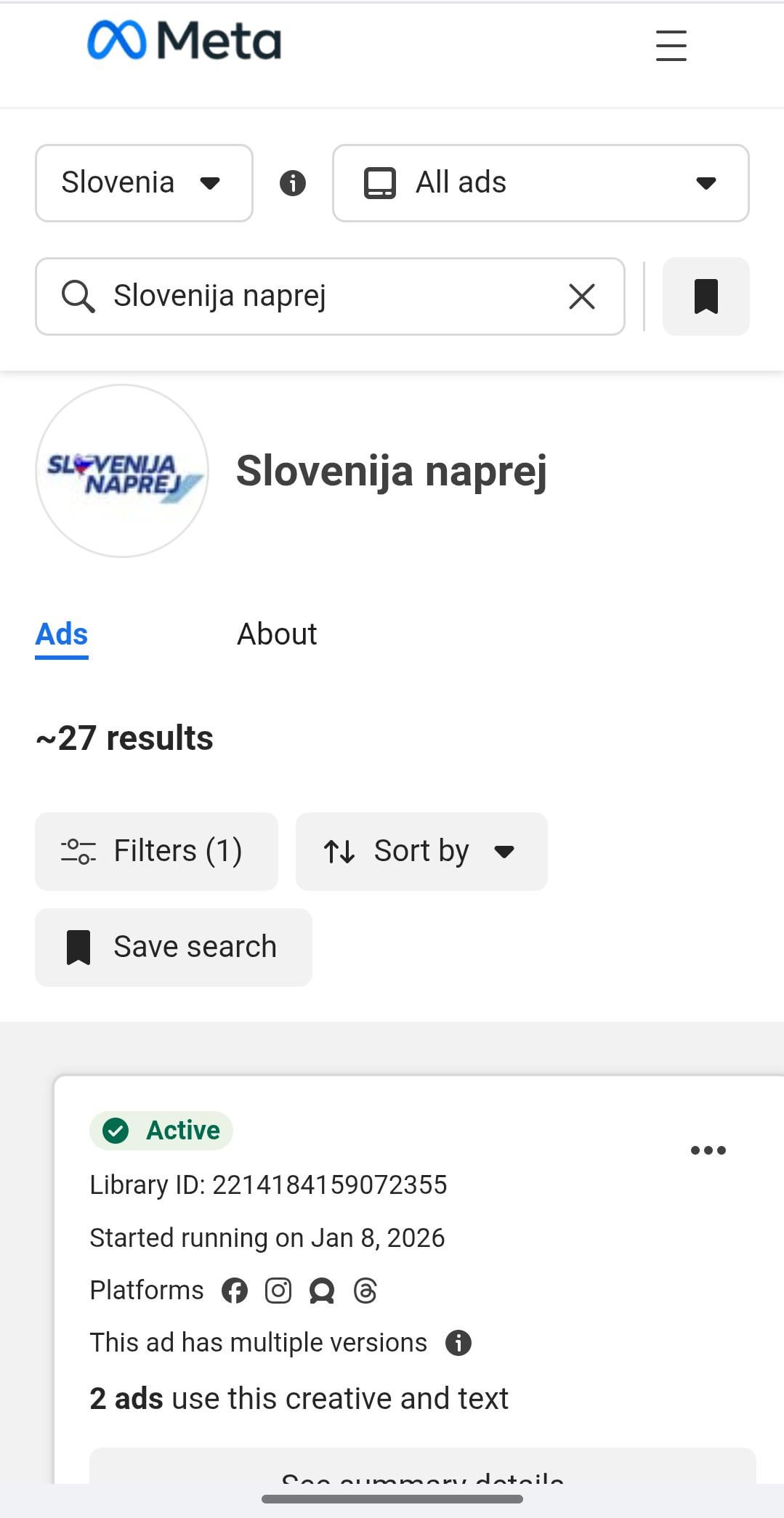 Come accennato, i clienti non hanno più pubblicità su Meta. Tuttavia ci sono 27 annunci attivi sul profilo Slovenia Next. Svoboda viola quindi direttamente le regole di Meta, nonché il regolamento dell’UE.
