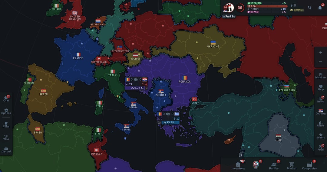 TL;DR: WarEra.io è una strategia di vita reale nello stile di eRepublic, in cui giocatori reali gestiscono paesi reali. La Serbia attualmente ha circa 150 giocatori attivi (6° posto), è uscita dalla grande guerra con l’Italia e ora è alla ricerca di nuove persone per la guerra, la politica e l’economia. Il gioco non è pay-to-win, funziona benissimo su telefono e PC e premia il gioco di squadra a lungo termine. Unisciti a noi su disaccordo!