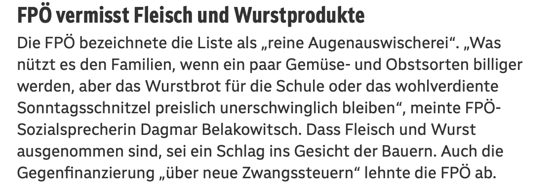 La dicitura: "…ma il panino con la salsiccia per la scuola e la meritata cotoletta della domenica…"è ancora una volta retorico "Capolavoro" – ma cosa ti aspetti da Dagmar Belakowitsch. I poveri bambini che non riescono più a procurarsi la salsiccia a buon mercato dal discount sul pane…
