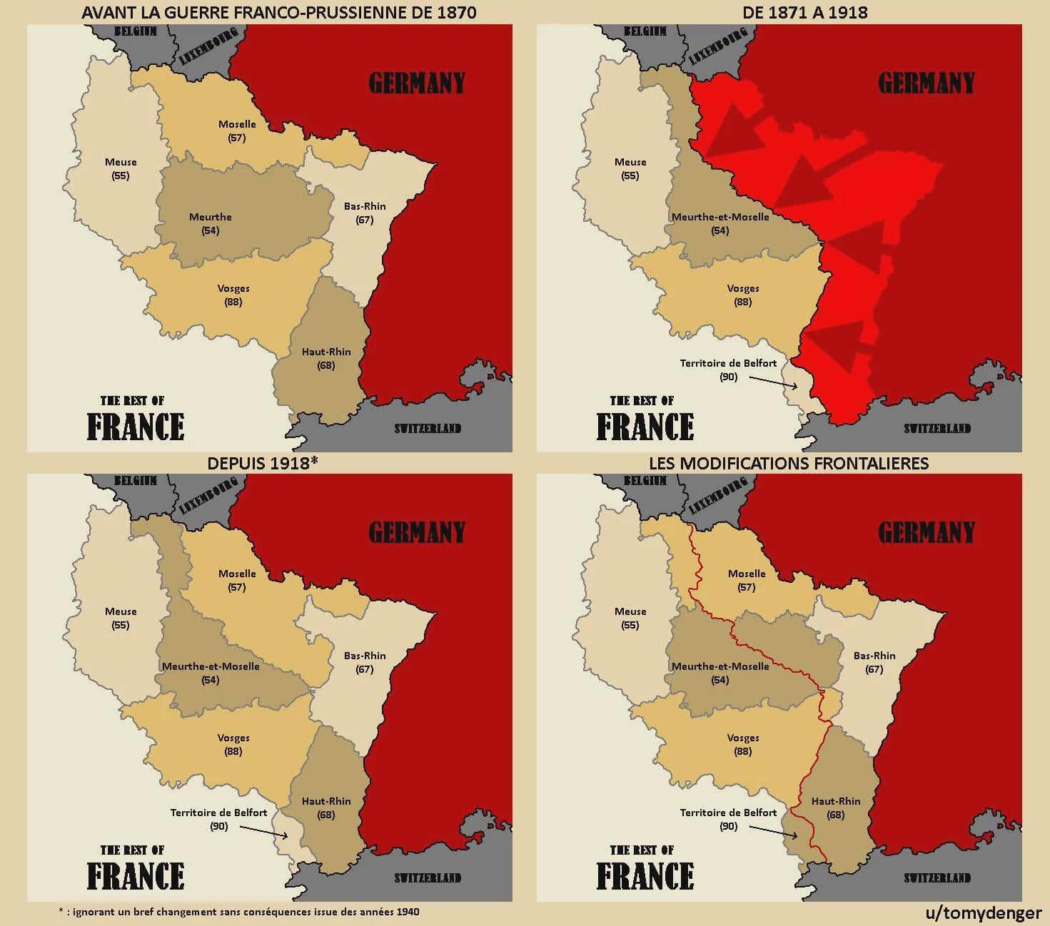 Et il me semble que le bout des Vosges qui a été perdu était pour compenser le détachement de Belfort du Haut-Rhin que les prussiens n’avait jamais pris a cause de la résistance acharnée de la place forte