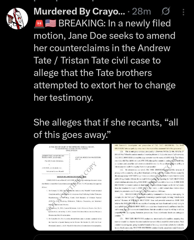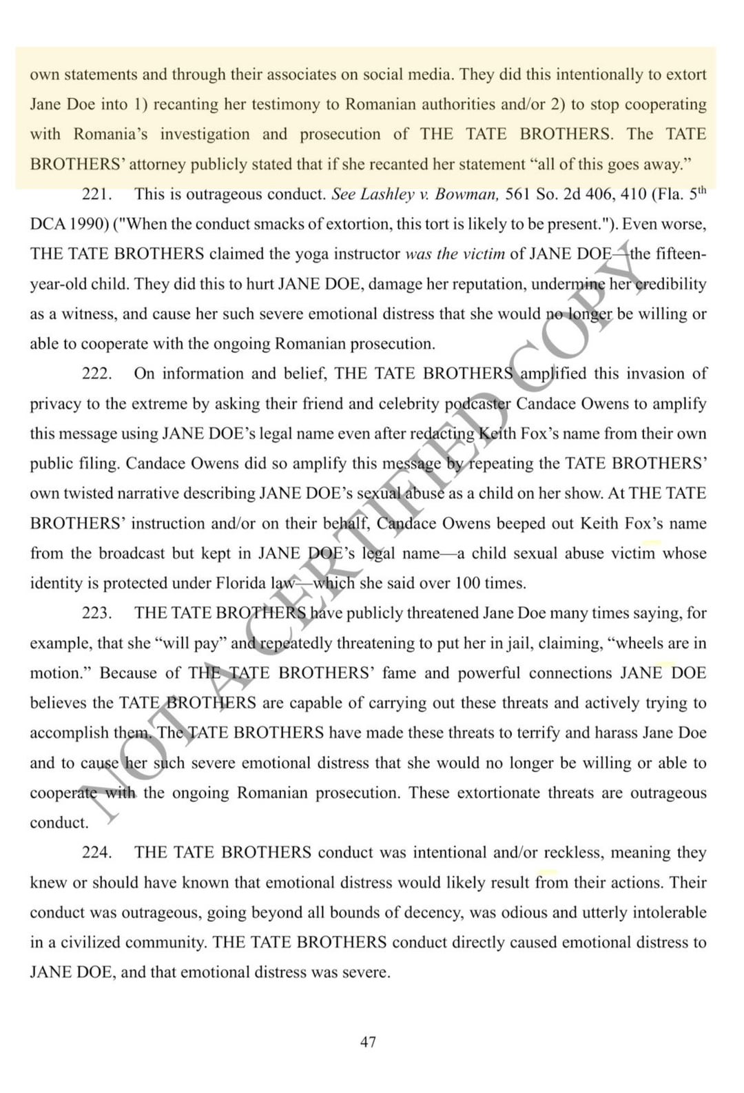 La vittima parla di questo ricatto nella denuncia civile intentata contro i fratelli Tate in Florida in risposta alla causa dei fratelli contro la vittima.