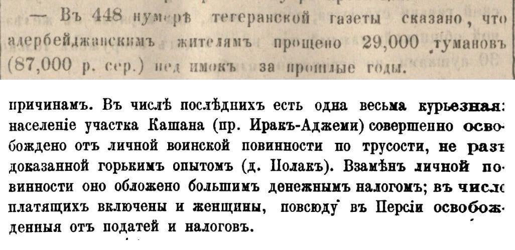 1) Nel numero n. 448 del quotidiano di Teheran si legge che agli abitanti dell’Azerbaigian sono stati condonati gli arretrati pari a 29.000 tuman (87.000 rubli d’argento) di tasse non pagate negli anni precedenti.