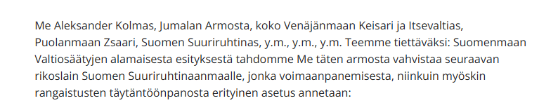 Il Codice penale della Finlandia si apre con il solenne proclama emesso a nome dell’imperatore Alessandro III, il testo completo è: