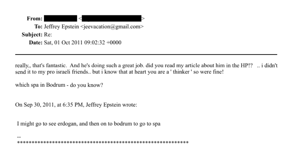 — "Davvero, è fantastico. E fa un ottimo lavoro. nell’HP [Huffington Post] Hai letto il mio articolo su di lui!? ..non l’ho inviato ai miei amici filo-israeliani… ma so che in fondo sei un “pensatore”, quindi va bene! Quale spa a Bodrum: lo sai?"
