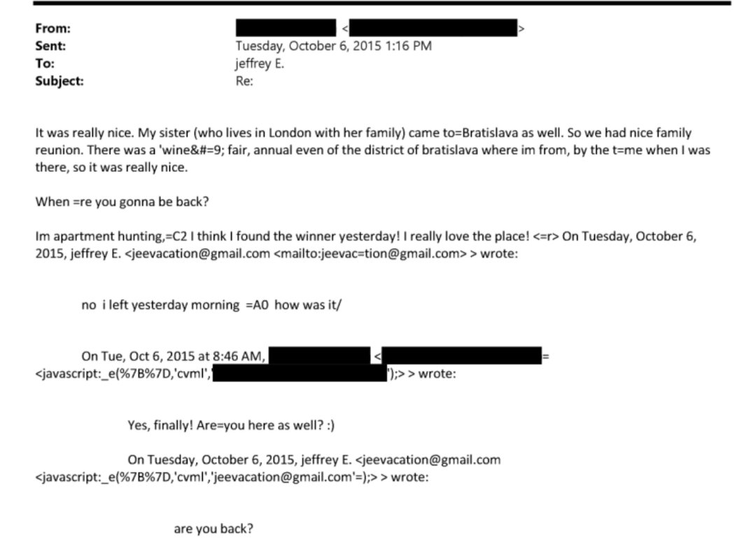 Comunicazione da qualcuno di Bratislava del 2015 su un incontro di famiglia e una domanda su Epstein "quando dormirà".
