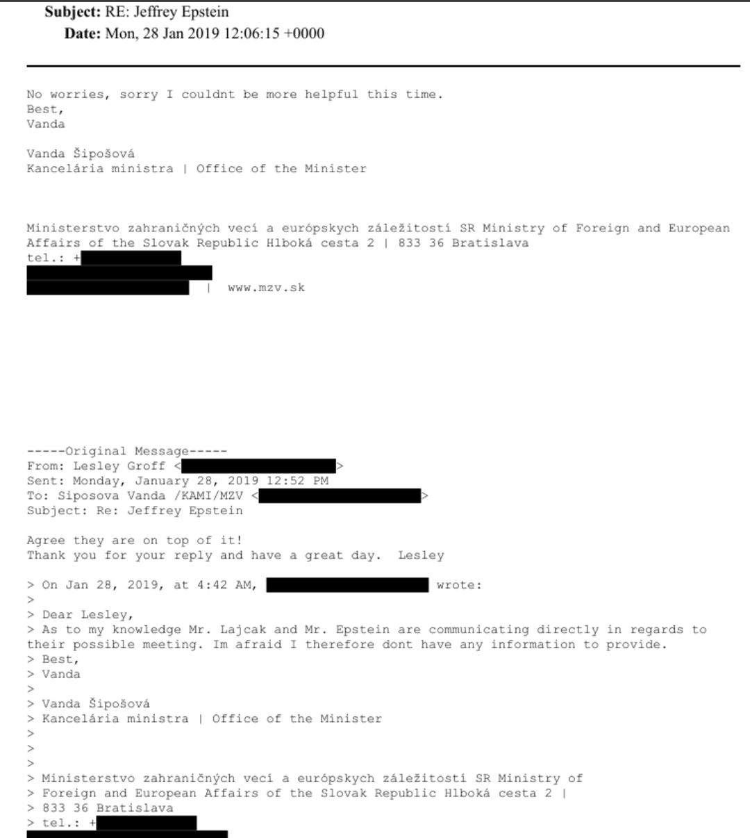 Comunicazioni di Vanda Šípošová (diplomatico slovacco) e Lesley Groff, assistente e reclutatore di Epstein, sull’incontro tra Lajčák ed Epstein.