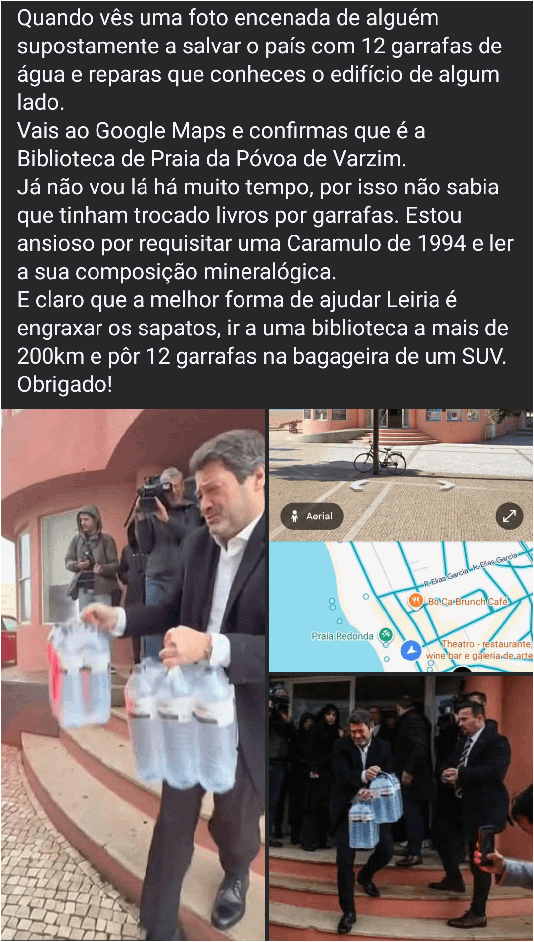 Vocês acreditam mesmo que se ele tivesse fingido que isso é Leiria a comunicação social não tinha já divulgado a mentira? Ele aqui está a recolher comida e água para levar. Apesar de no Reddit só se publicar convenientemente as garrafas de água, no IG dele podes encontrar videos que mostram que são muito mais do que água. É muita comida. E aà ele estava a encher o carro com o que recolheu. Não está a dizer que está naquele momento em Leiria. É muito mais do que eu fiz, e é muito mais do que a maioria aqui se calhar fez. Eu não ataco pessoas que ajudem outras. É campanha polÃtica? Sim, também. Mas podia não ter feito nada, tal como os restantes não fizeram nada sem ser falar. Pelo menos alguém beneficiou.