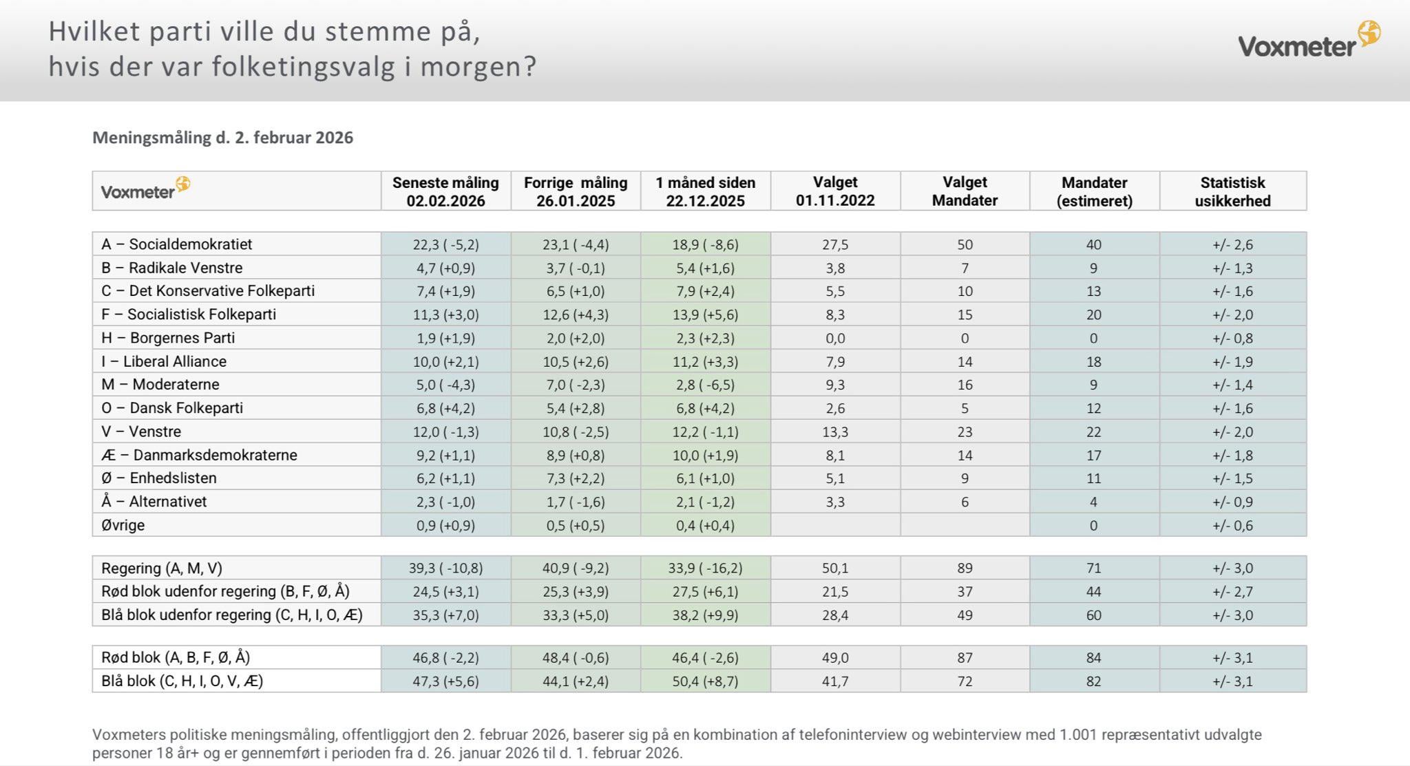 Sondaggio di Voxmeter: Il bagliore dei moderati (7% -> 5%) sembra essere in via di ritorno. La sinistra sembra prendere il sopravvento su una parte dei voti (10,8 -> 12%). Il blocco blu entra in coda.