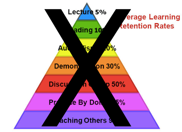 La “piramide dell’apprendimento” viene spesso citata per giustificare la forzatura dei bambini con risultati elevati a svolgere lavori ben al di sotto delle loro capacità: “Impareranno meglio la materia se proveranno a insegnarla ai loro compagni di classe più lenti”. Qual è la fonte originale di questa piramide? Qualcuno se l’è appena inventato. Veramente. Puoi vedere di più qui: https://theeffortfuleducator.com/2017/11/29/the-pyramid-of-myth/