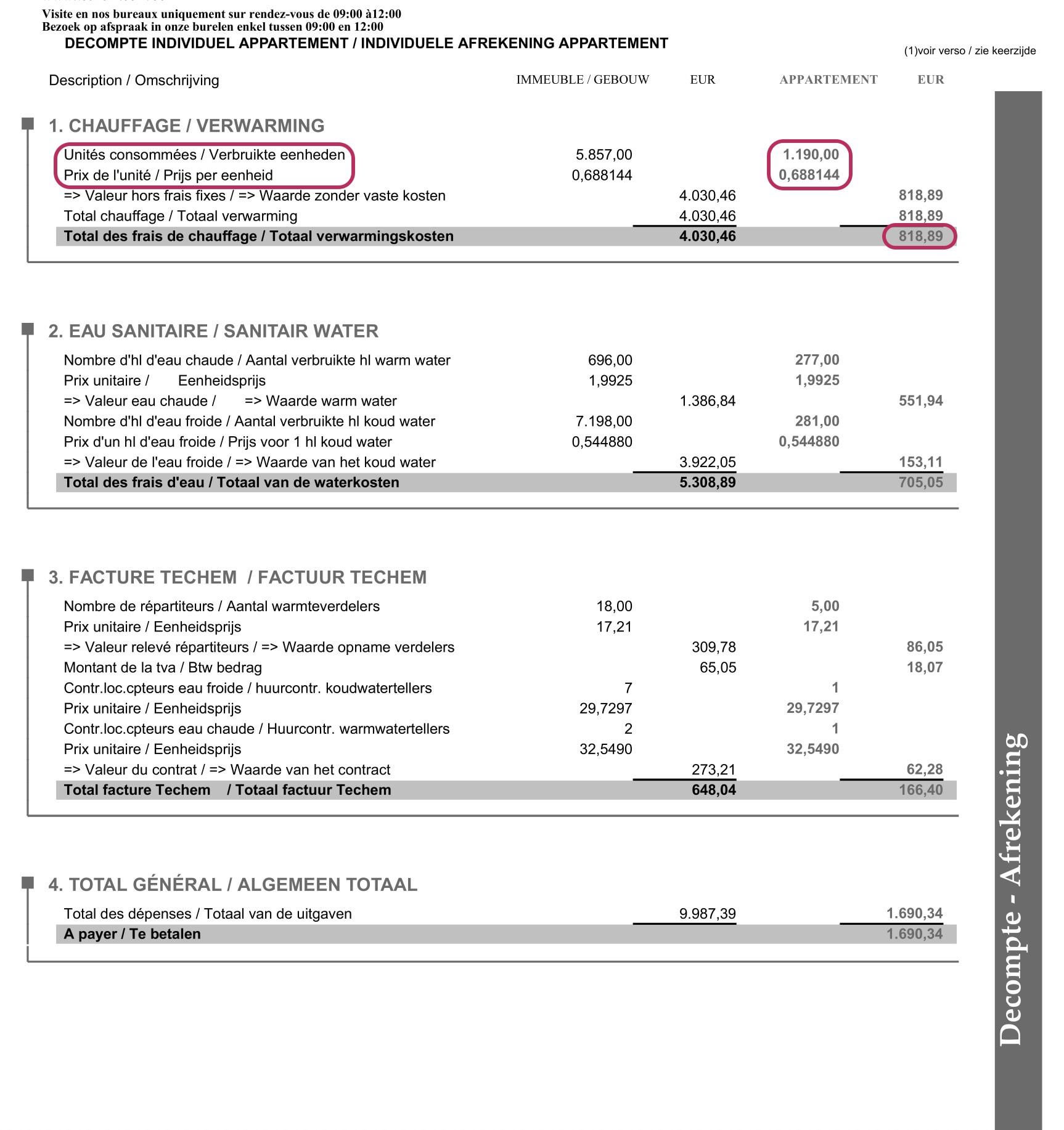 Ho appena ricevuto il mio ultimo Bolletta del riscaldamento Techem (periodo: dal 09/2024 al 09/2025) per un appartamento in Belgio (Kraainem), e la sensazione totale molto alto per me. Mi piacerebbe ricevere qualche feedback, soprattutto per quanto riguarda prezzo unitario (calorimetro/ripartitore costi di calore) e la logica generale del calcolo.