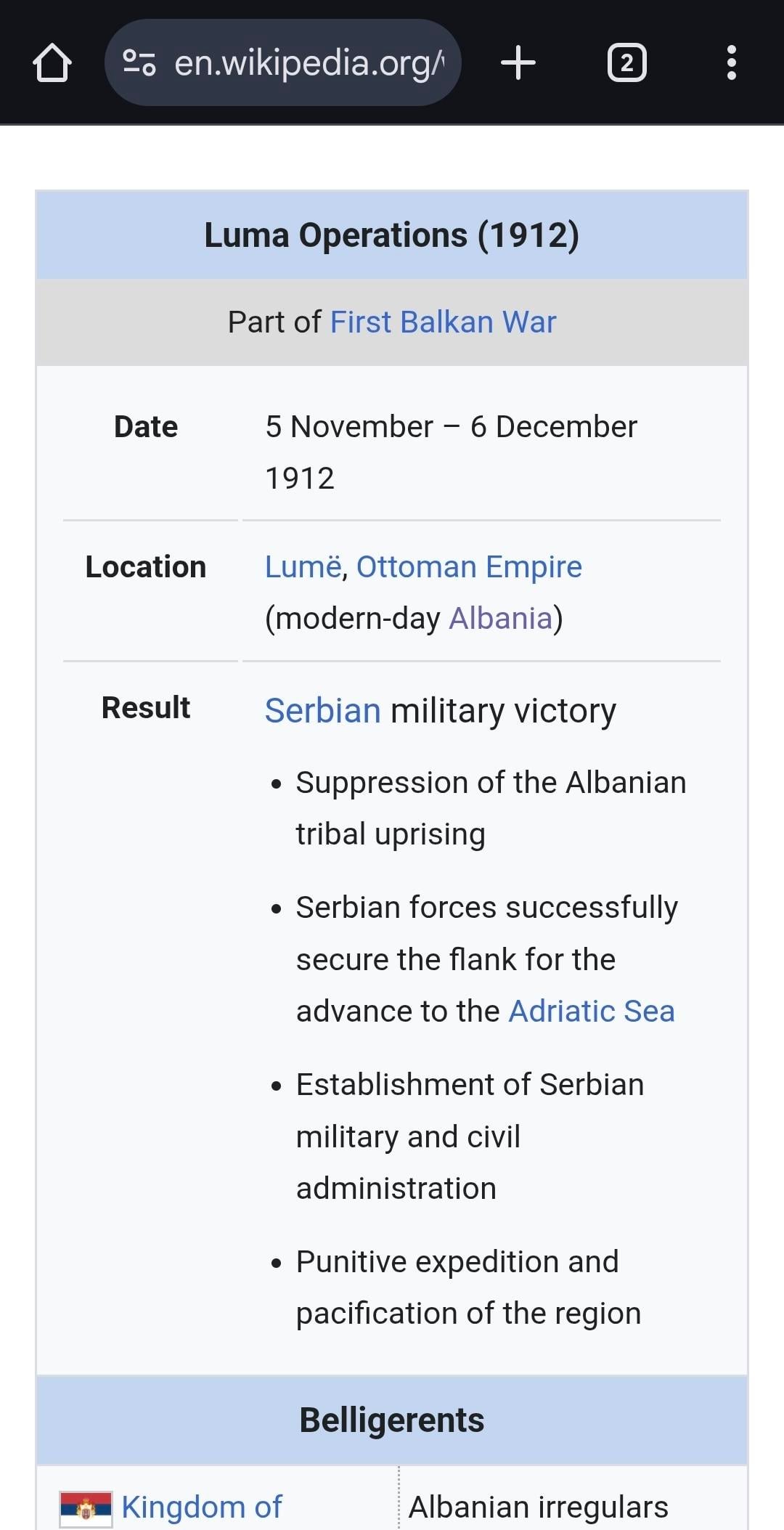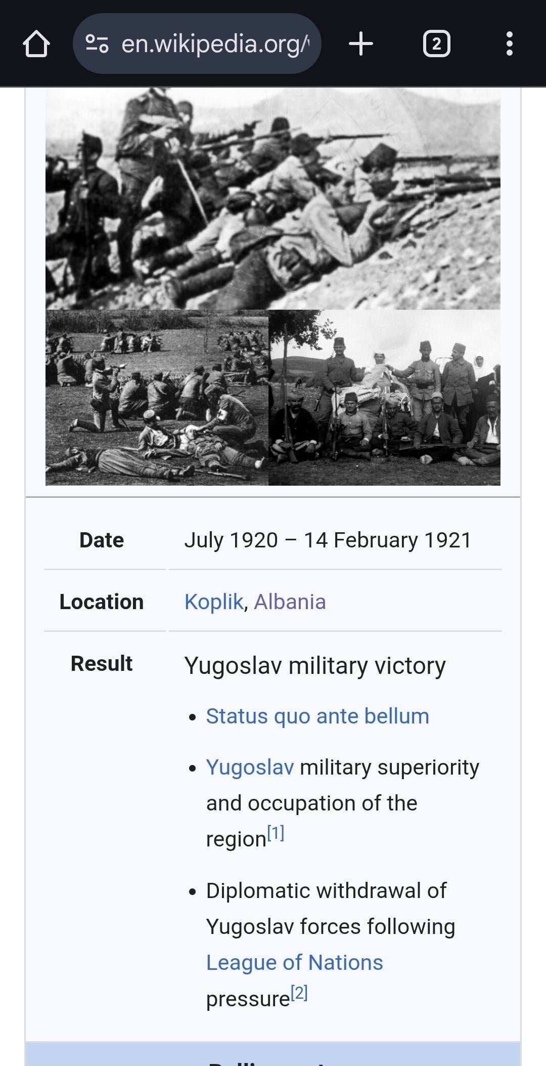 I serbi sono entrati in Wikipedia e hanno falsificato i risultati delle guerre vinte dagli albanesi, come le guerre di Dibran dove si è svolta la battaglia di Lume, questa è stata una vittoria per gli albanesi, anche la guerra di Koplik è stata una vittoria per gli albanesi, anche la guerra di confine tra Albania e Jugoslavia è stata una vittoria per gli albanesi. Qualche mese fa scrivevano la vittoria dell’Albania, ma ora l’hanno cambiato.