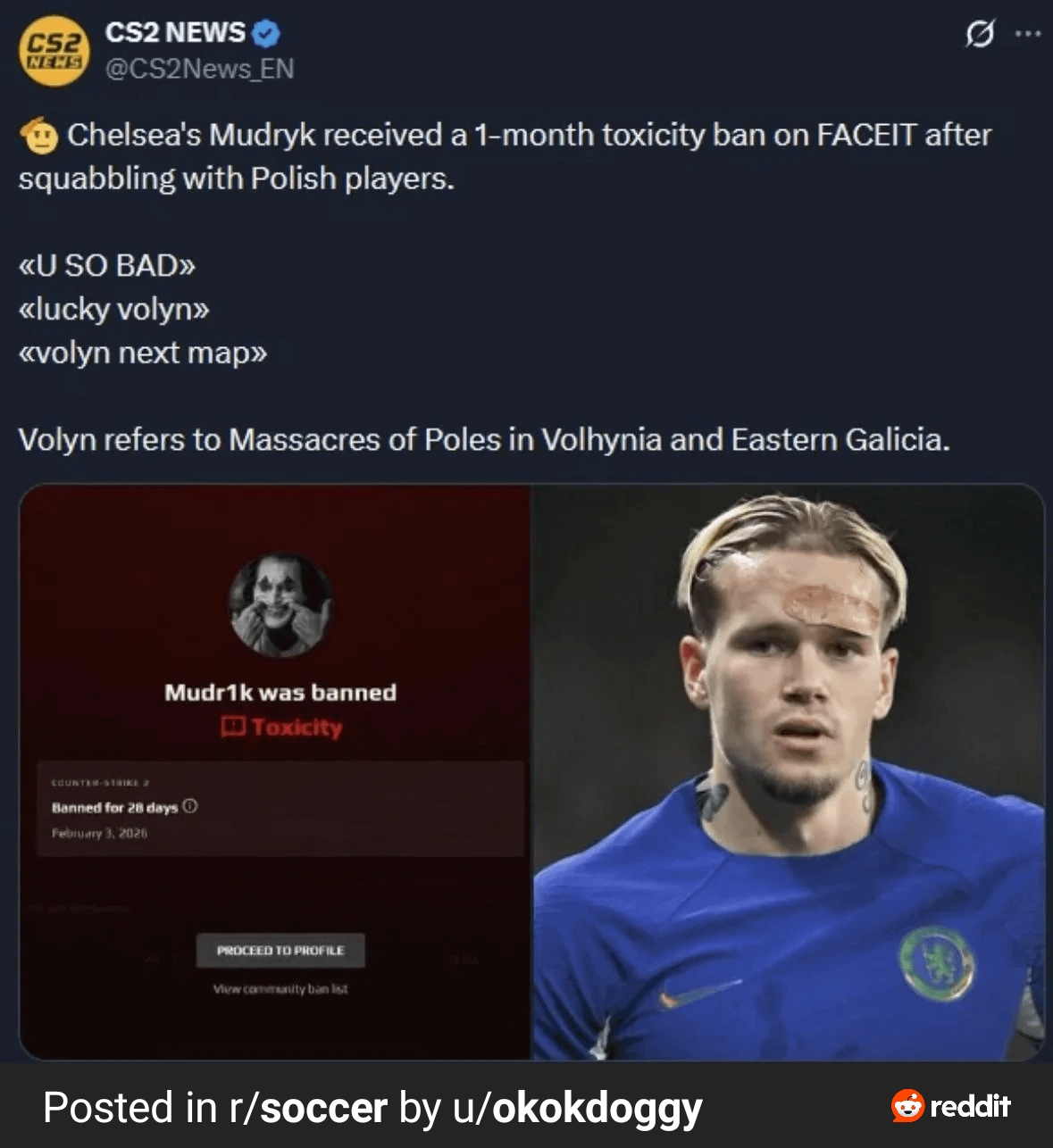 Mudryk del Chelsea ha ricevuto un ban di tossicità di 1 mese su FACEIT dopo scambi con giocatori polacchi in cui ha ripetutamente menzionato Volyn in riferimento al massacro dei polacchi in Volinia e nella Galizia orientale