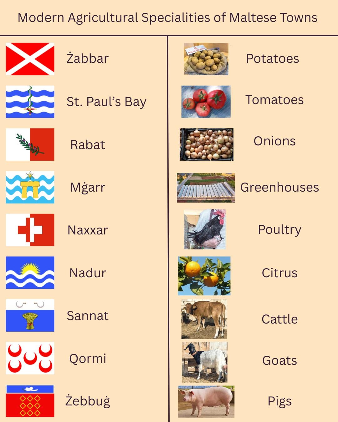 Un’istantanea di dove oggi si trovano più comunemente diverse colture e allevamenti a Malta, basata esclusivamente sull’attuale presenza agricola e piuttosto necessariamente sulla tradizione storica.