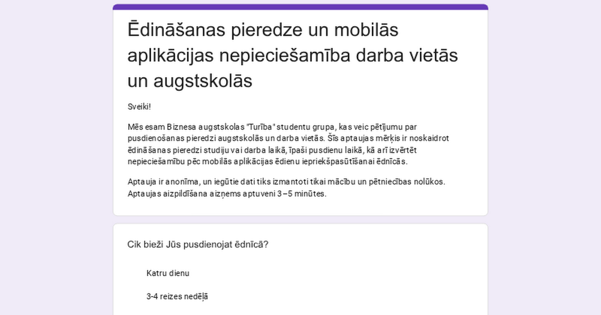 Aptauja par ēdināšanas pieredzi augstskolās, darba vietās