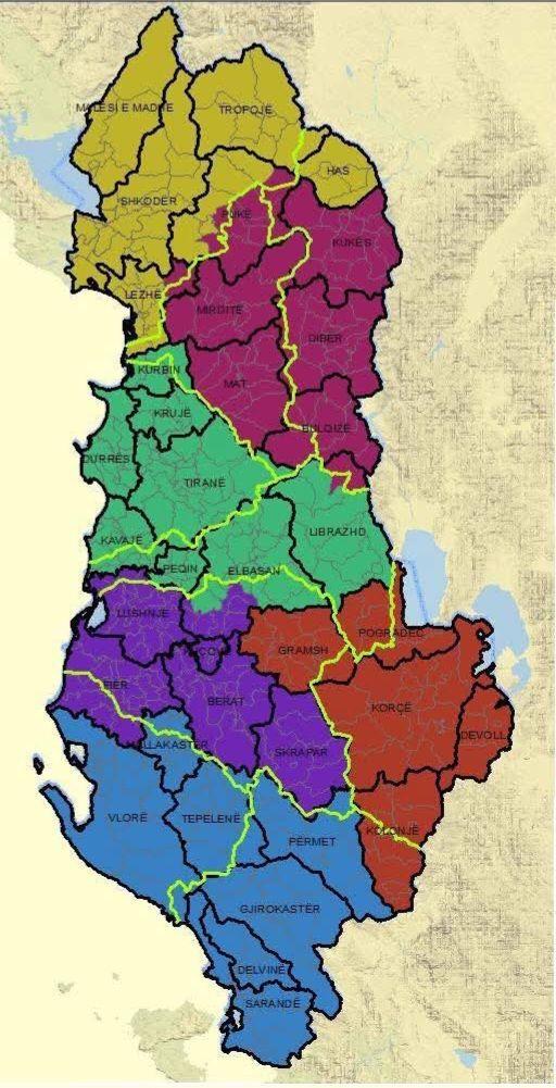 La particolarità è che la divisione è quasi la stessa dei tempi di Zogu. Il distretto di Has diventa un’unità amministrativa di Kukës. Il distretto di Kolonje si fonde tra i distretti di Korça e Argirocastro. Tutti i distretti avranno accesso al mare, ad eccezione dei distretti di Korça e Dibra.