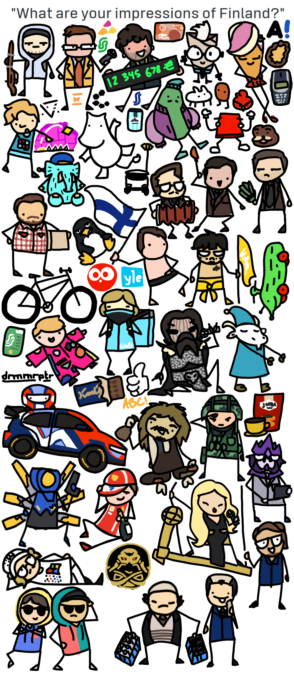 Carta K-Plussa, torta della Carelia, S-market, Nokia (modello 3310), quello stupido orsetto:DDDD, tentacolo(?), Mr. Tokmanni, Tux Penguin, "al mercato" amico, Käärijä, kurkkumobo, Wolt Courier e la bici dalle ruote grasse, Mr. Lordi, Mr. Clutterbuck, S-Etukortti, studente con una tuta a pezzetti, barretta di cioccolato Karl Fazer, stazione di servizio ABC+diner, macchina da rally, Rölli, uniforme militare finlandese, Juhla Mokka, V1, Kimi Räikkönen, Erika Vikman, Paavo Siljamäki (non gli somiglia per niente 😭), e il "miglior A-Team"