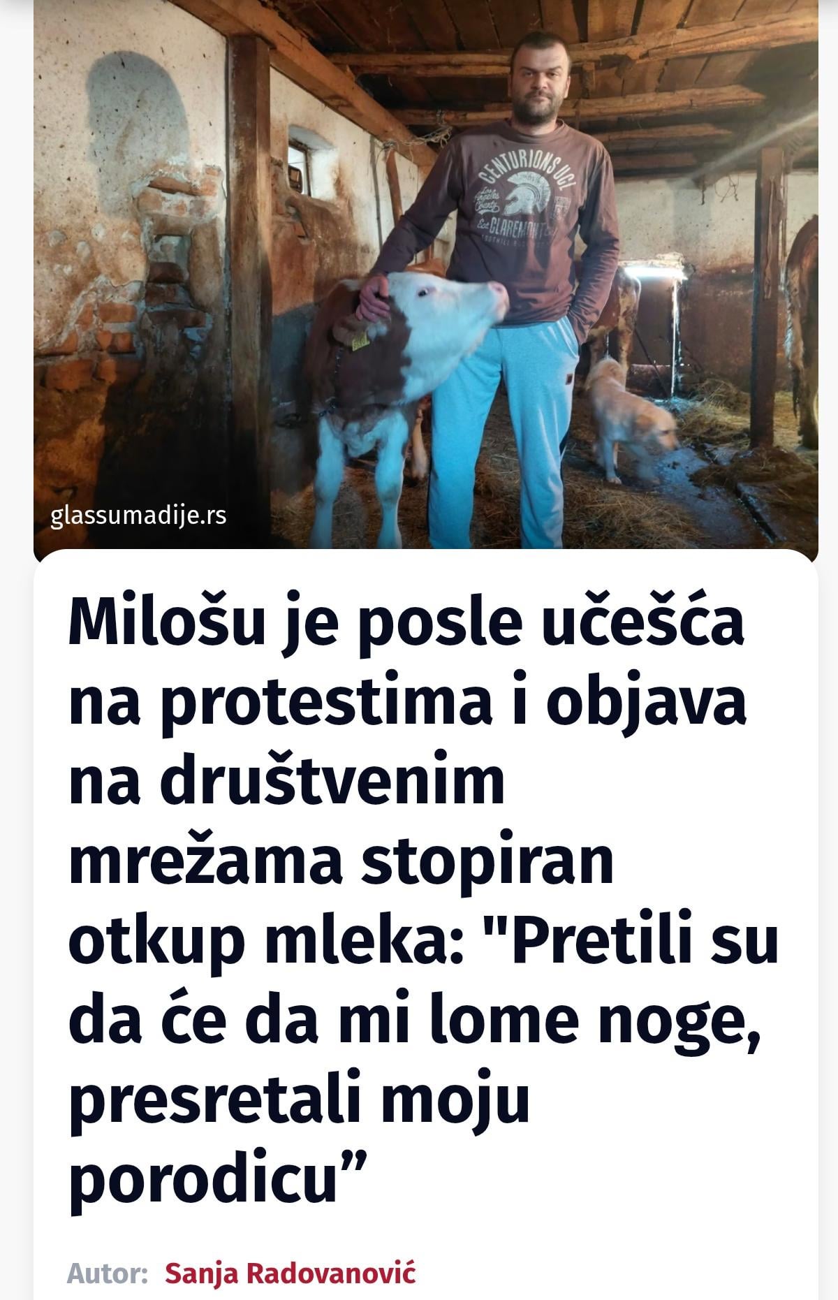 Testo dell’amministratore delegato: https://nova.rs/vesti/drustvo/milosu-je-posle-ucesca-na-protestima-i-objava-na-drustvenim-mrezama-stopiran-otkup-mleka-pretili-su-da-ce-da-mi-lome-noge-presretali-moju-porodicu/