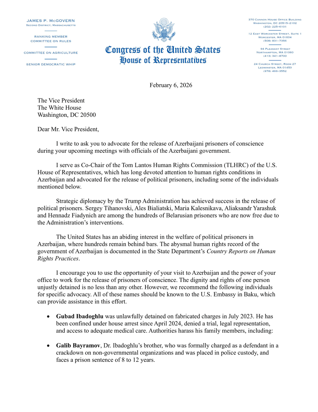 Il deputato statunitense Jim McGovern invia una lettera a JDVance e Marco Rubio, invitandoli a sollecitare le autorità azere a rilasciare i prigionieri politici come ha fatto l’amministrazione Trump per la Bielorussia.