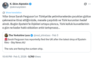 "Anni fa, quando ci siamo opposti alle riprese segrete di Sarah Ferguson sui bambini negli orfanotrofi di Türkiye, la questione è stata distorta e le istituzioni turche sono state prese di mira. Oggi, quando viene rivelata la loro relazione con Einstein, non è più indiscutibile quanto avessero ragione le forze dell’ordine turche quel giorno…"