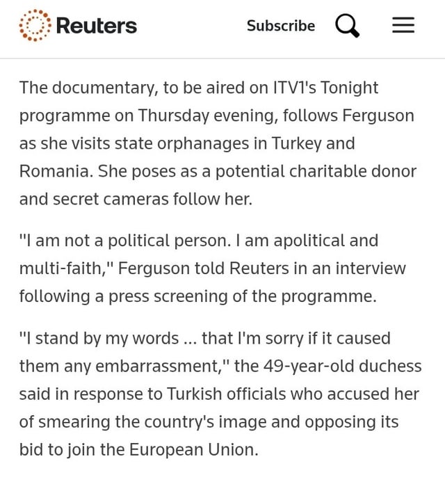 HA SPARATO DI NASCOSTO?Sebbene tutto ciò sia ovvio, mi viene in mente un altro incidente che Entitled ricorda. Nel 2008, le immagini di Sarah Ferguson che filmava segretamente per la televisione ITV in un orfanotrofio vicino ad Ankara causarono grandi polemiche. Le autorità turche hanno intentato una causa contro queste immagini nel 2012 per “violazione della privacy”.