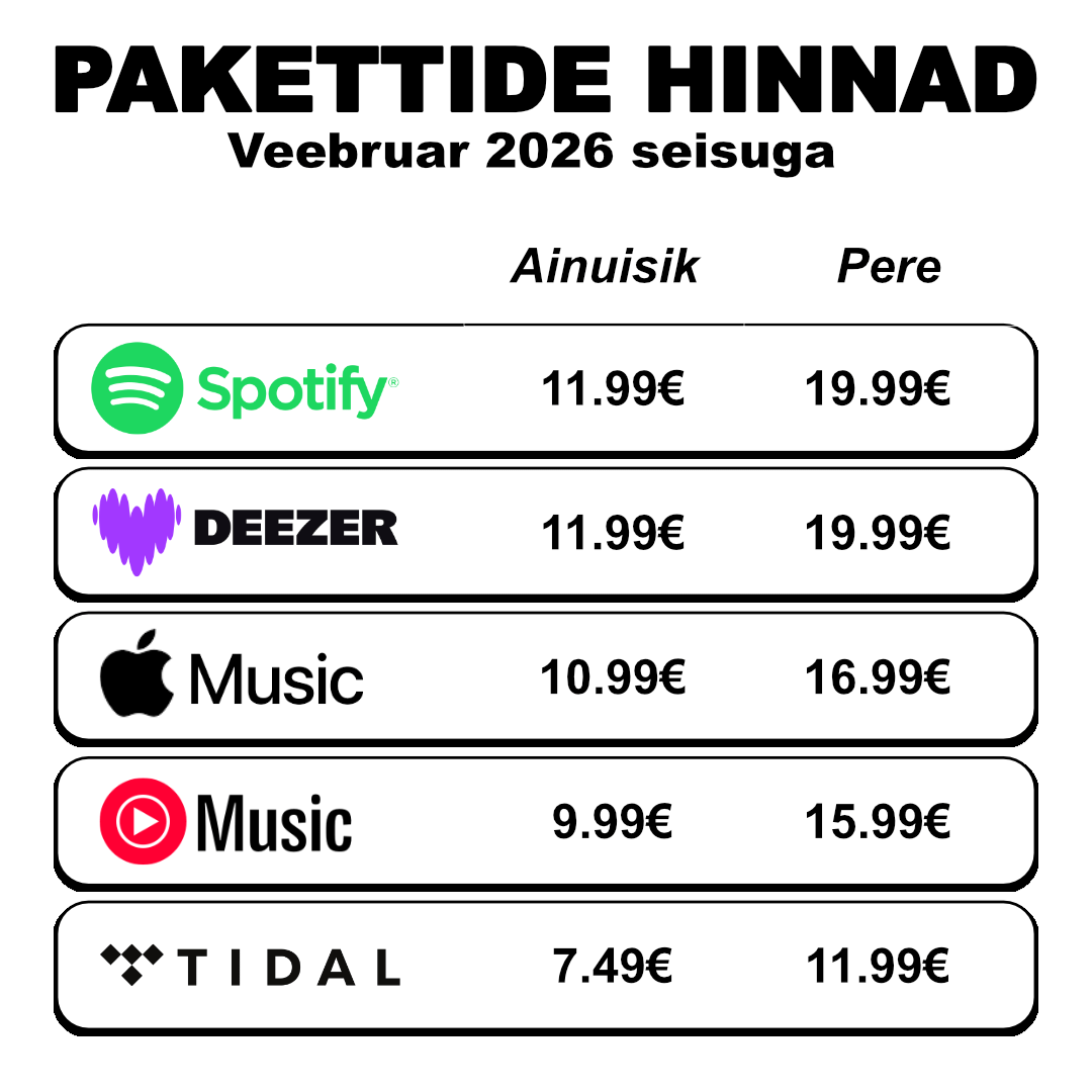Dopo l’aumento di prezzo del 18-25% da parte di Spotify, ho fatto una ricerca sui pacchetti musicali disponibili e sui relativi prezzi. Amazon e molti altri servizi di nicchia sono stati esclusi perché il loro listino prezzi era difficile da trovare o il catalogo era troppo piccolo. Nel caso di Amazon i prezzi sono simili a quelli dei servizi di Apple Music e Youtube Music, ma in più vengono aggiunte le tasse. Fairmus, menzionato nell’articolo dell’ERR, costa 4,99€ al mese, ma il catalogo contiene soprattutto artisti estoni e non tutti.