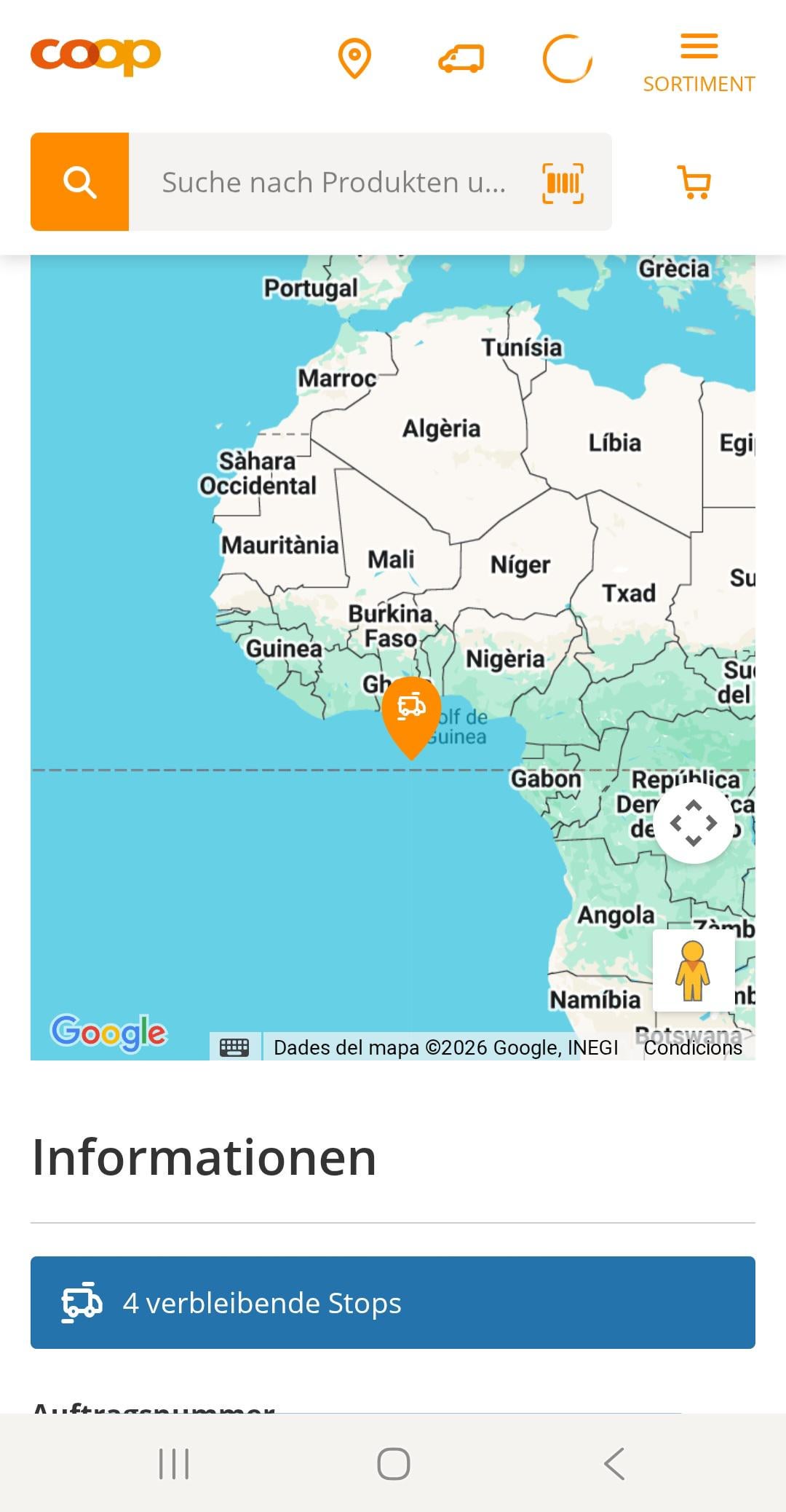 Il monitoraggio della mia spesa Coop e del camion per le consegne è attualmente mostrato da qualche parte in Africa sulla mappa.