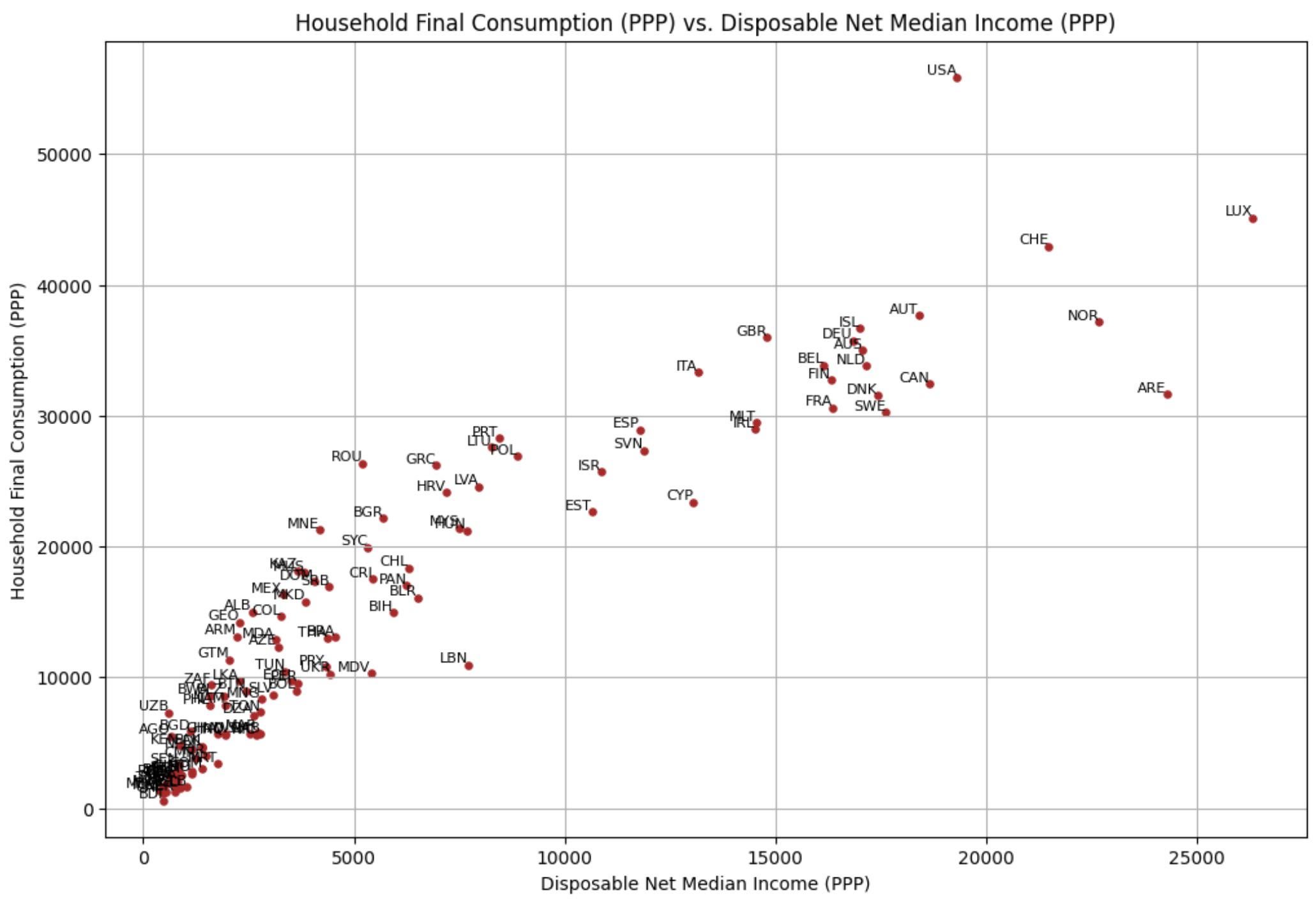 Consumi finali delle famiglie (PPA) vs Reddito mediano disponibile (PPA)