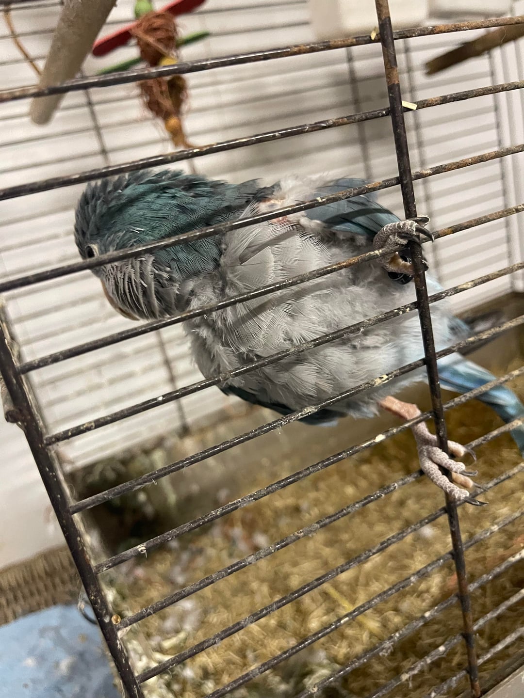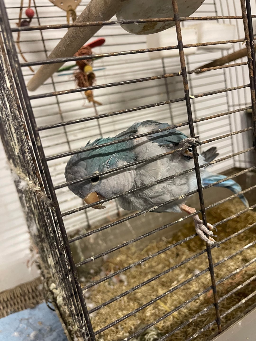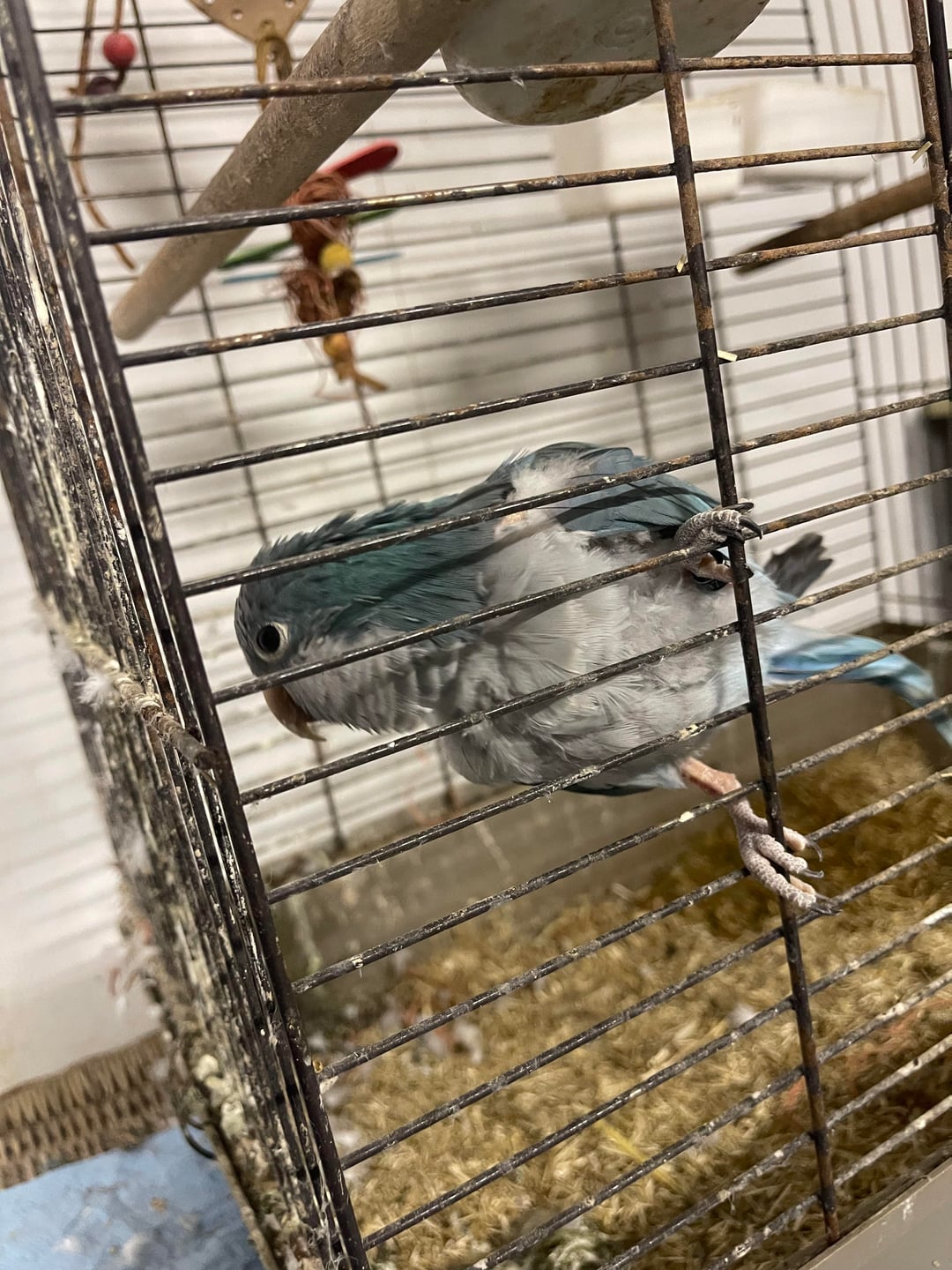 La gabbia sembra molto sporca, non vedo giocattoli o puzzle e sembra che l’uccello si stia strappando le piume dal petto. Il parrocchetto è costantemente in quello spazio, che spesso è freddo e buio.