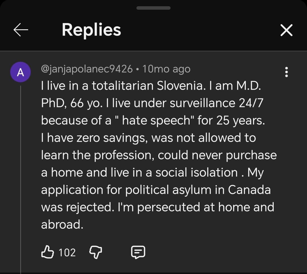 Such_Housing_6850 on 09/02/2026 08:32 Drugje se to dogaja in bi verjel, v sloveniji pa tega (še) nisem slišal. Kolikor vem niti zakonov proti sovražnemu govoru nimamo
