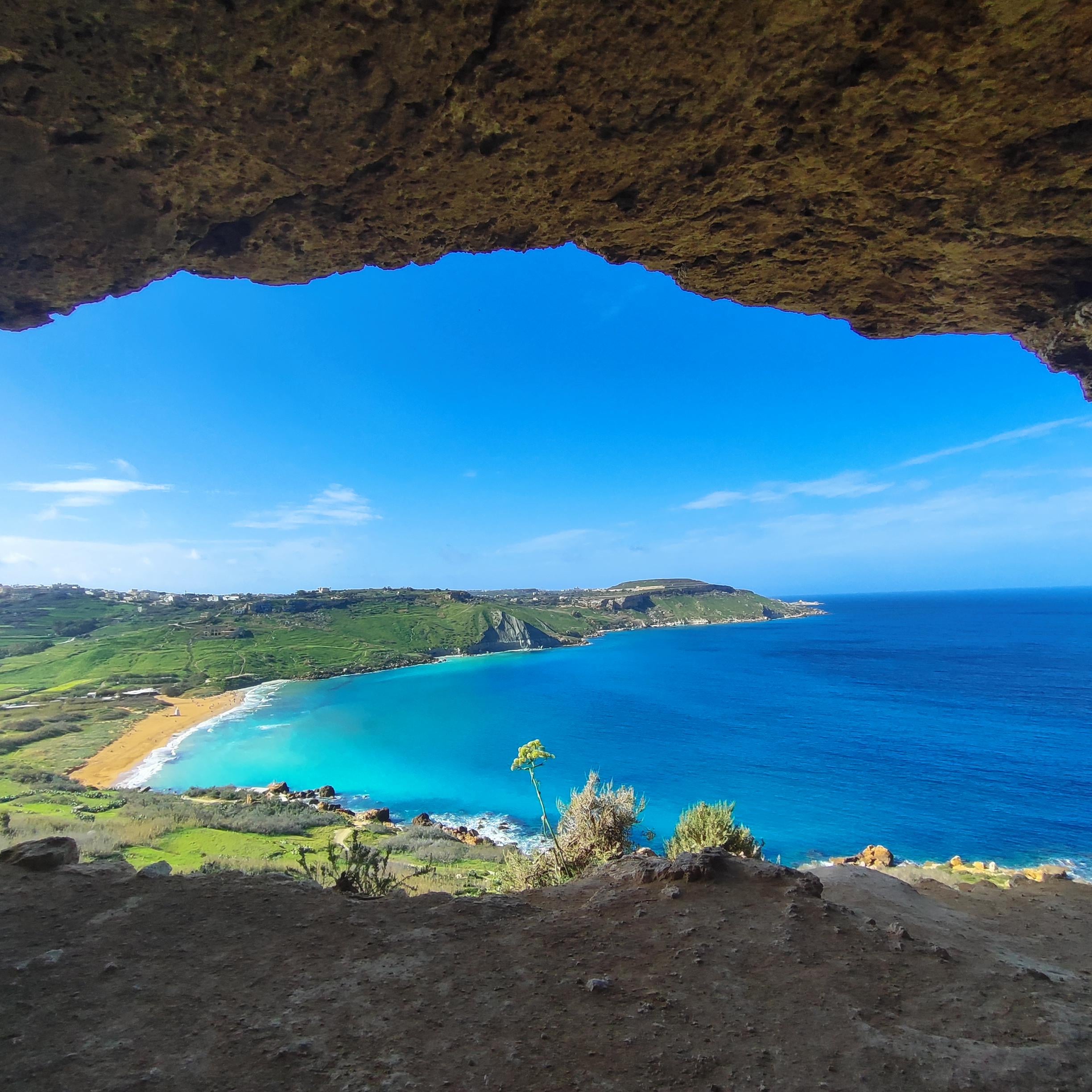 Una bellissima foto della baia di Ramla dalla grotta Mixta scattata il 26/07/26☀️. Per chiunque sia interessato a vivere questo panorama c’è un pittoresco sentiero dalla baia alla grotta😊. https://i.redd.it/6hyct2a04pig1.jpeg di WonderfulTangelo7173