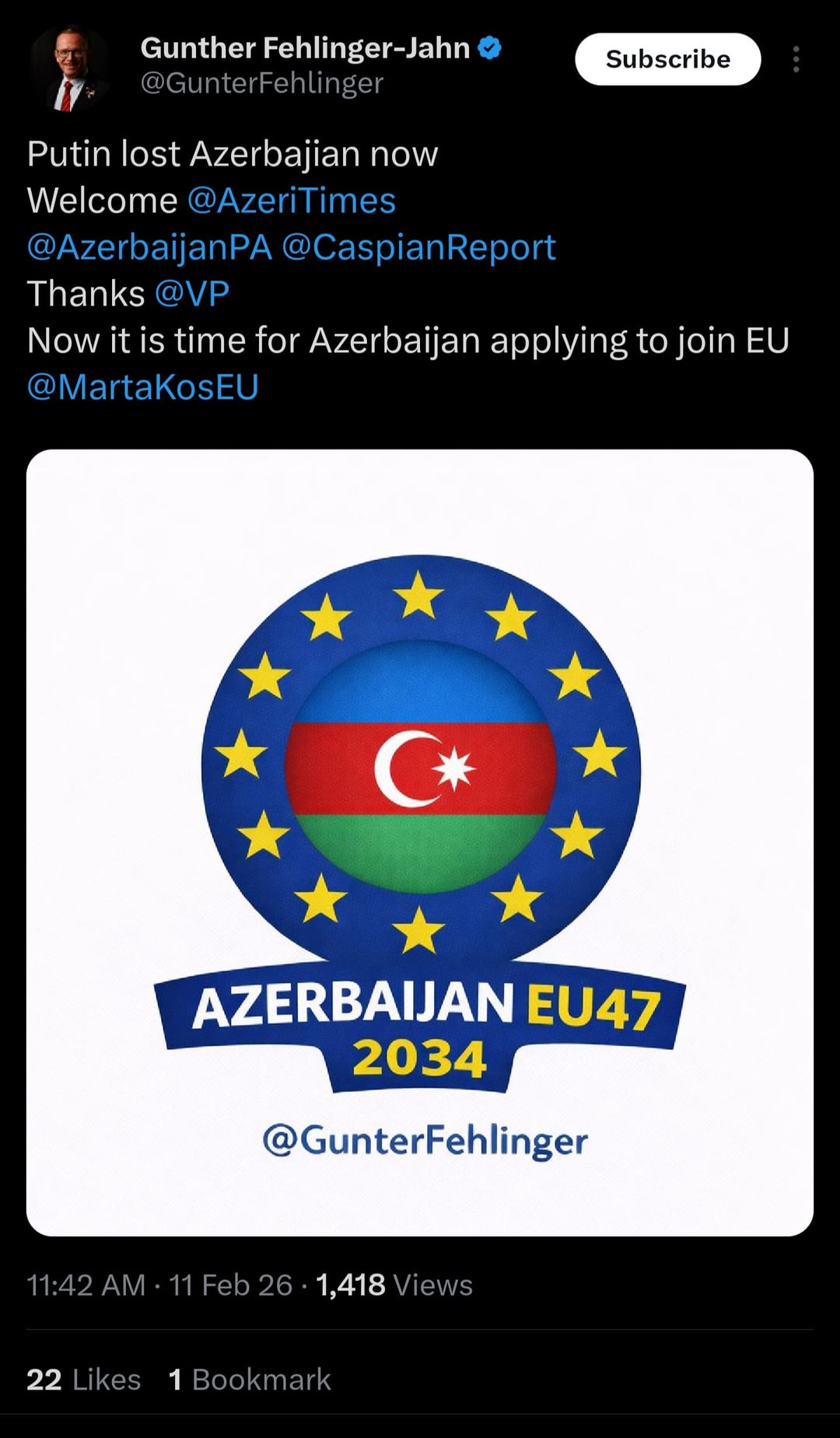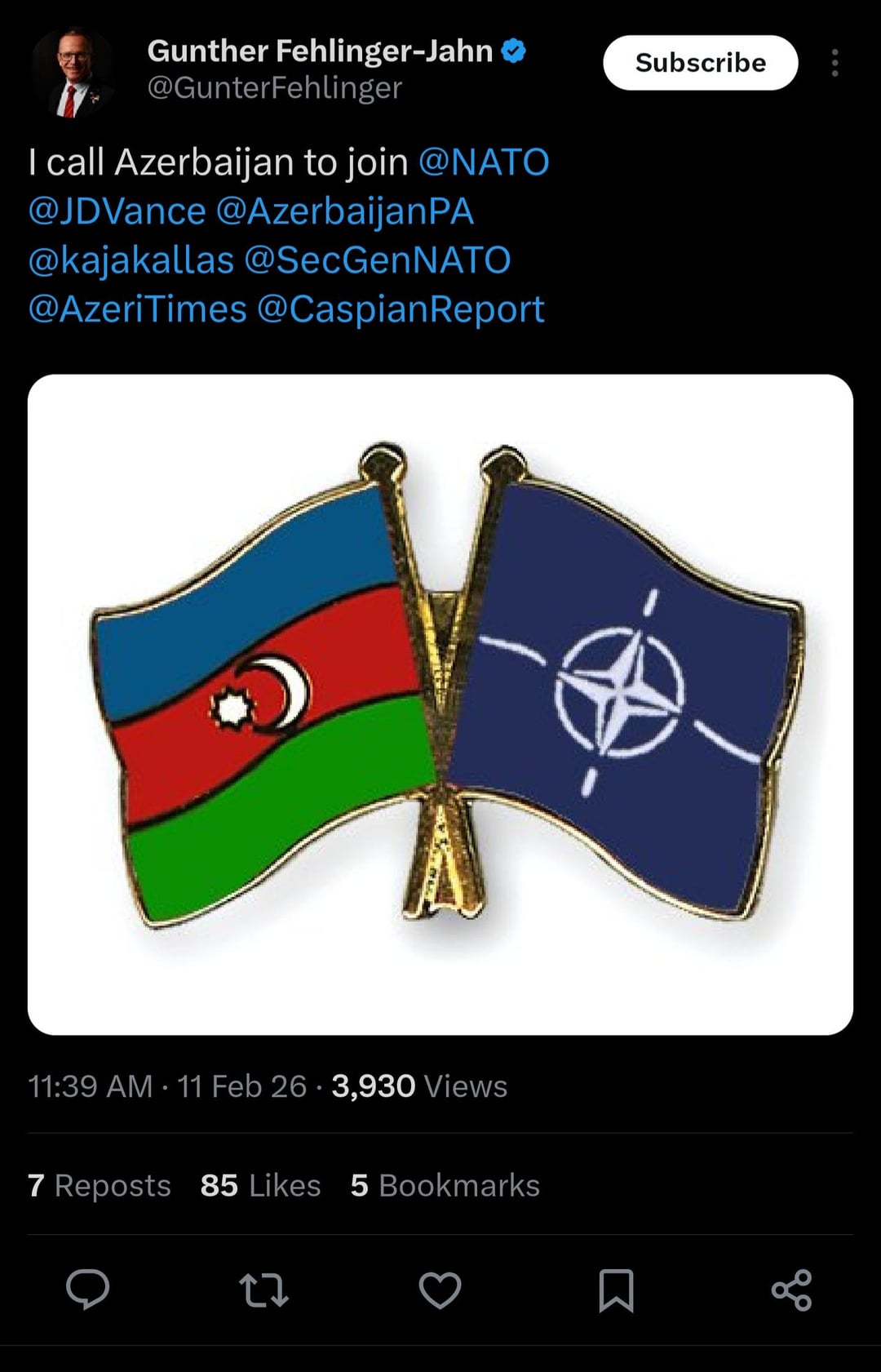 Il presidente del Comitato austriaco per l’allargamento della NATO Gunther Fehlinger-Jahn invita l’Azerbaigian ad aderire all’UE, la NATO su X https://www.reddit.com/gallery/1r1z1cv di datashrimp29