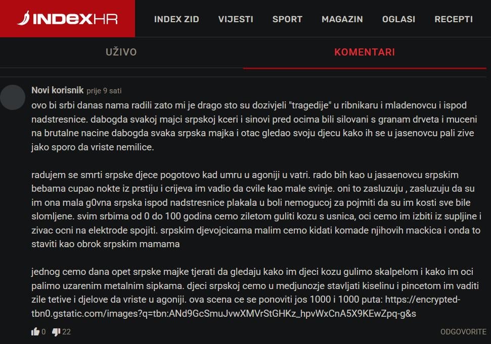 Anche se il mondo si trova nel periodo più delicato del dopoguerra, anche se il 90% della popolazione consuma informazioni esclusivamente da portali internet, i portali croati non solo non attuano alcun tipo di censura positiva, ma NON ATTUANO NEMMENO LA FORMA PIÙ LEGGERA DI MODERAZIONE.