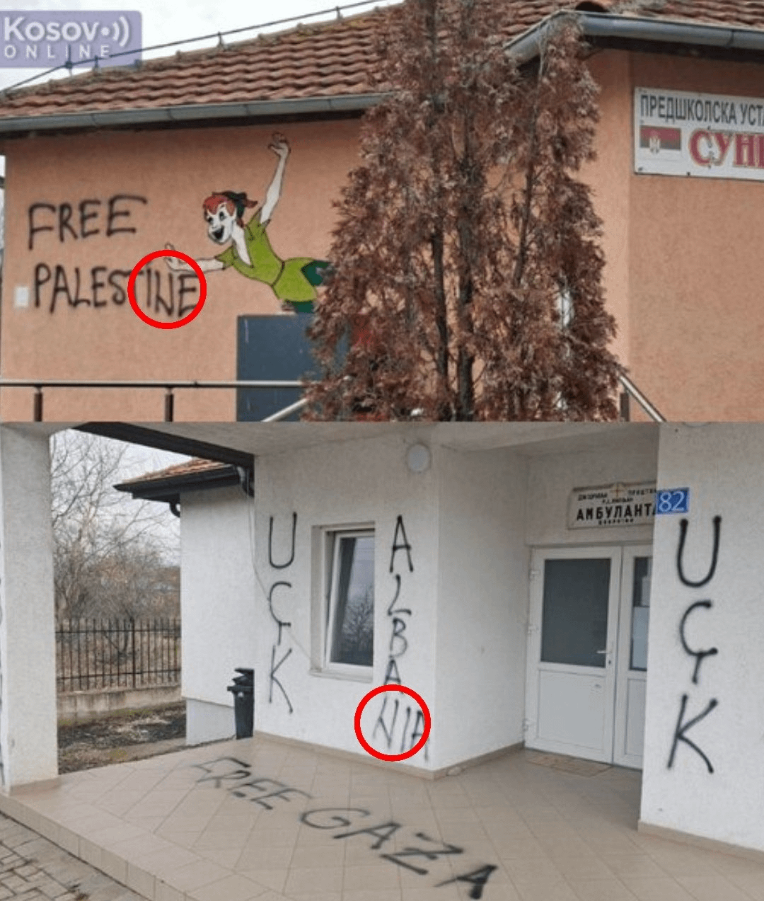 Nelle foto che il pubblico ne ha come prova "Attacco albanese"graffiti alle lettere "N" è scritto a mano in stile cirillico serbo (dove la linea diagonale inizia dal centro della lettera).