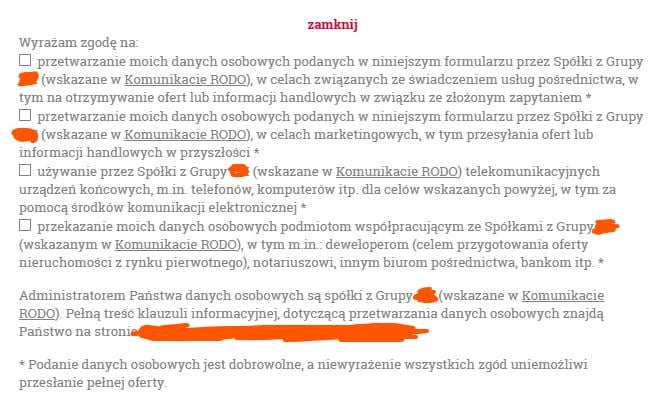 * zgody na przekazywanie danych podmiotom trzecim, w tym innym biurom nieruchomości oraz deweloperom.