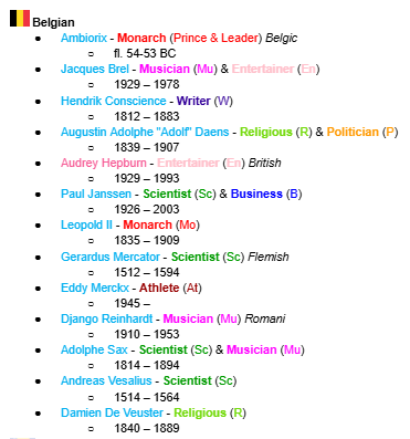 Voglio scrivere una storia in futuro con personaggi basati sulle persone più influenti di vari paesi nel corso della loro storia, spero che qualche amico appassionato di storia qui possa aiutarmi con il Belgio. Chiunque sia nato entro i confini moderni del Belgio conta perché, se fosse nato oggi, sarebbe classificato come belga, riceverebbe semplicemente la nota dopo il motivo per cui è famoso! Ho un sacco di categorie, quindi chiunque tu possa nominare andrà bene! Inoltre non parlo francese o qualunque lingua parliate lol, quindi userò un traduttore per conversare con chiunque lo desideri, cosa che mi piacerebbe!