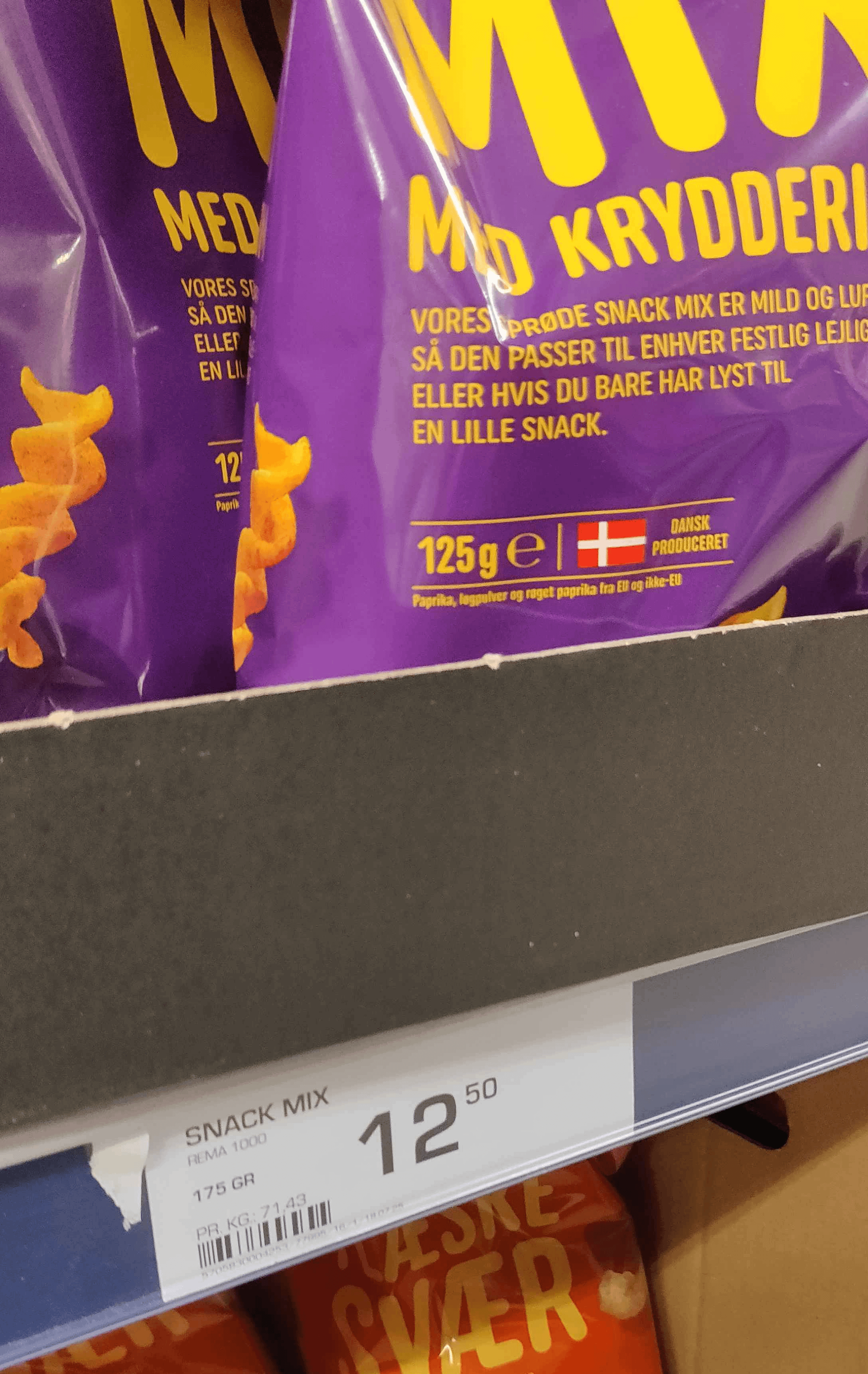 Il prezzo dice 175 g, mentre le nuove buste contengono solo 125 g. Una riduzione di 50 g ma mantiene il prezzo DKK 12,50. Classico contrazione.