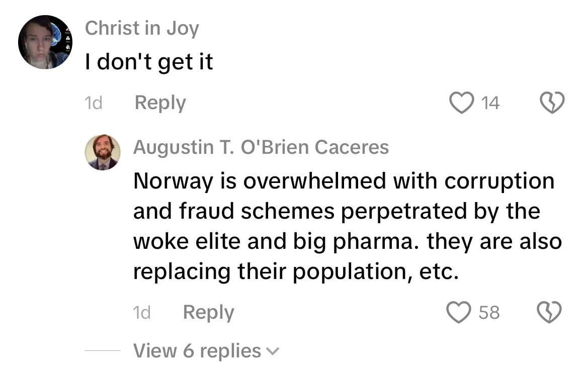 Untrue. People are rightly shocked by Epstein revelations pertaining to a handful of people, so anyone who seriously thought corruption couldn’t happen in Norway at all have been set straight, but it’s still one of the least corrupt societies around. Big pharma and replacing the population is bargain bin conspiracy bs.