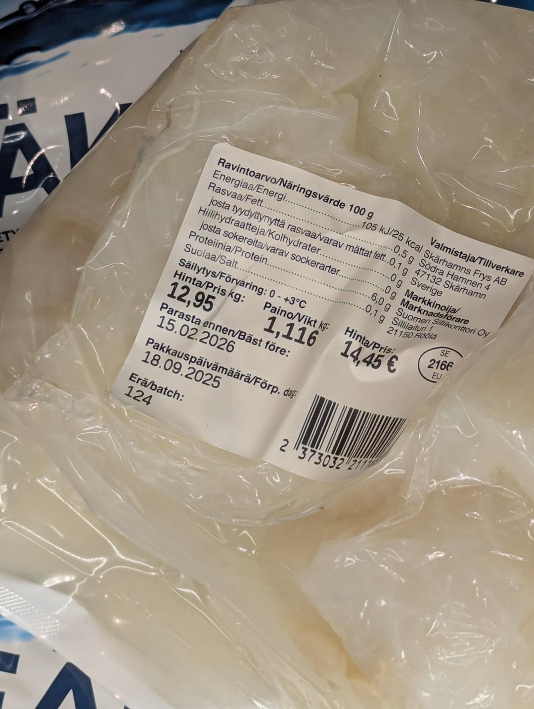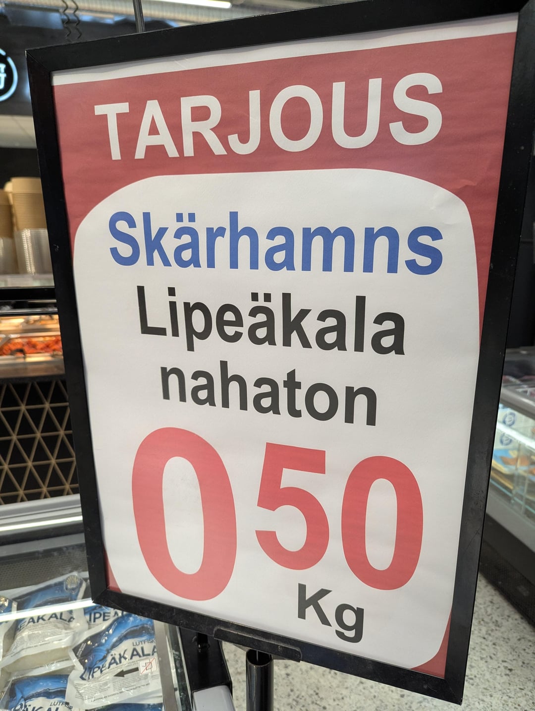 Suppongo che sia lutefisk, o qualcosa che somiglia a lutefisk. Questa settimana hanno abbassato i prezzi a 50 centesimi al kg per la data di scadenza.