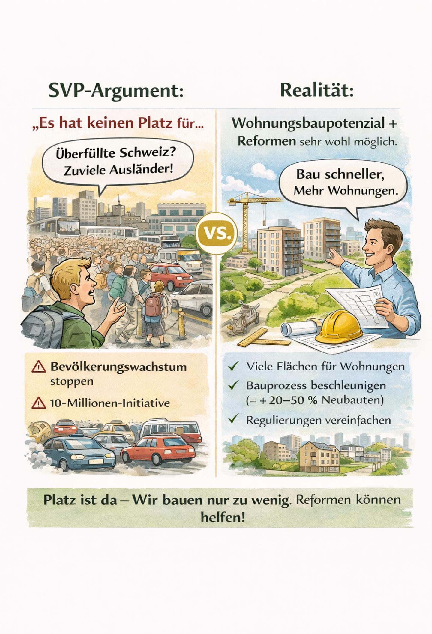Tutti lamentano di “non avere più spazio” ma in realtà ci sono spazi vuoti, i processi di costruzione durano sempre e le obiezioni bloccano tutto. Con una piccola riforma – approvazioni più rapide, limitazione delle obiezioni, uso intelligente dello spazio – potremmo costruire il 10-20% di appartamenti in più ogni anno. Quindi: abbiamo davvero “troppo poco spazio” o semplicemente troppa burocrazia? E quale sarebbe l’impatto sull’ambiente 🤔